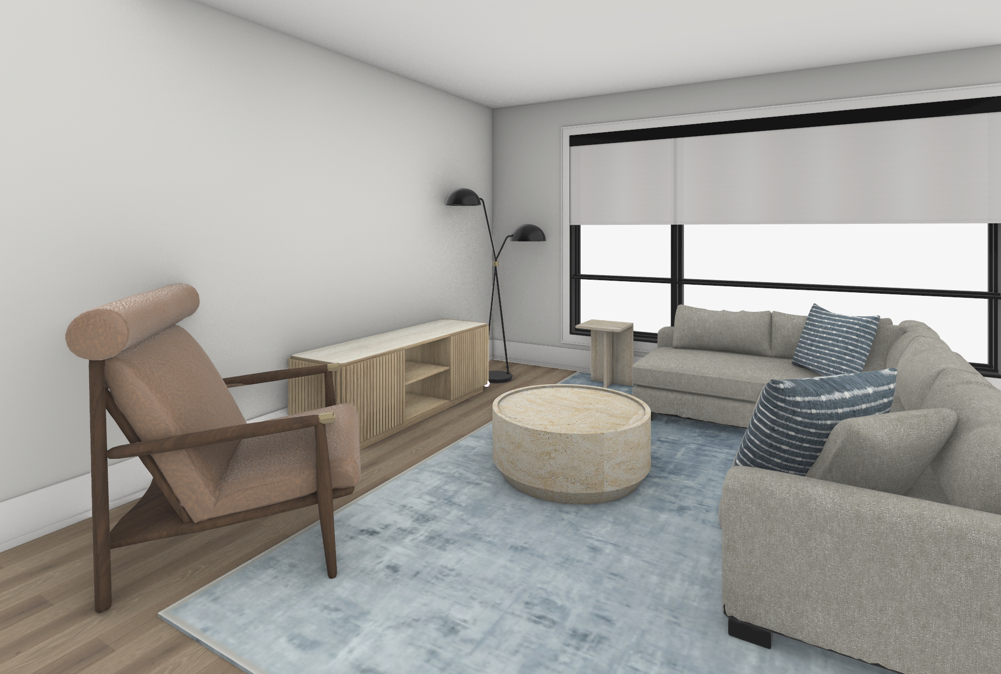 add a wall mounted tv on top of the media unit add natural lighting add accessories to coffee table and media unit add a residential city backyard to windows maintain colors and textures