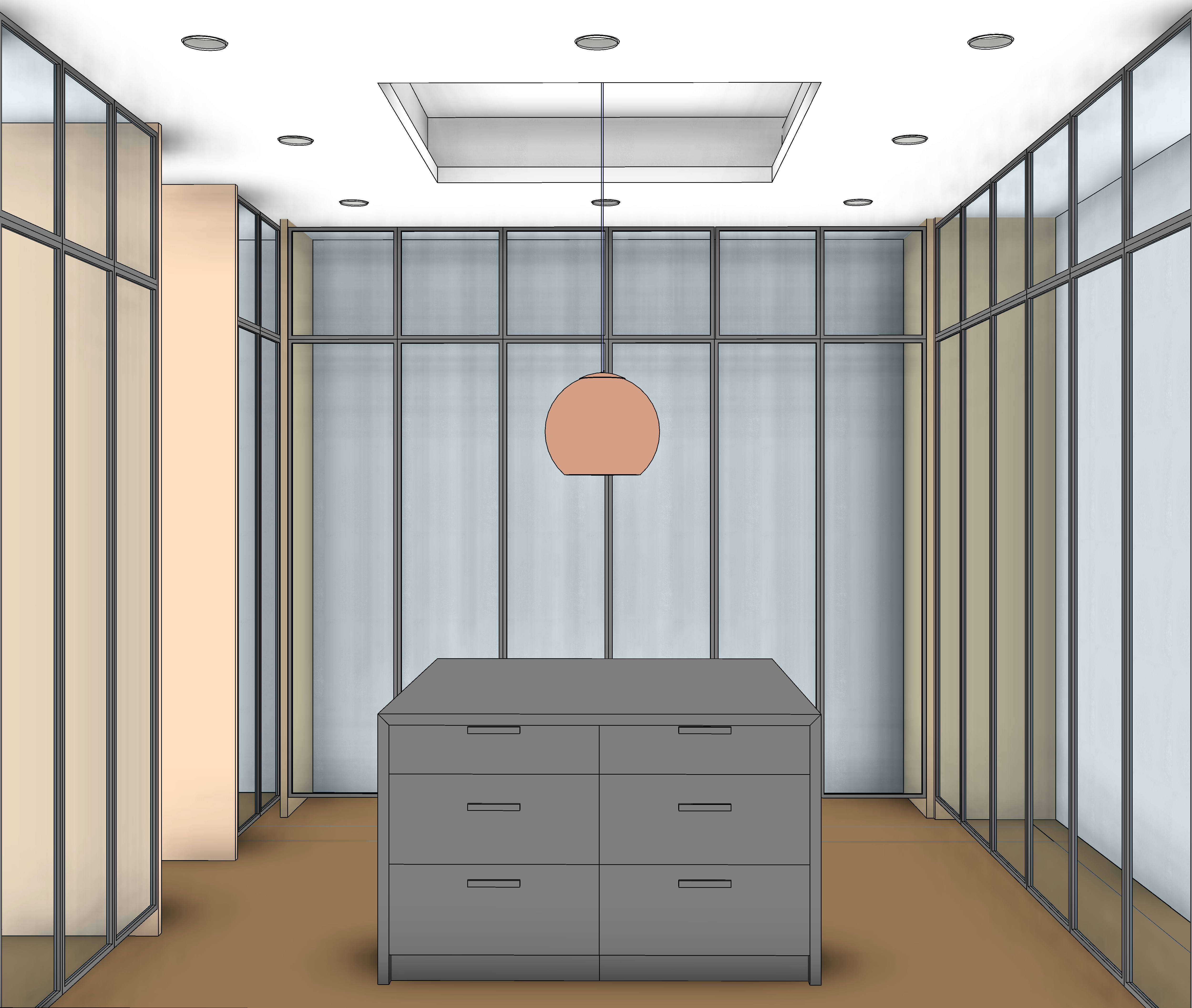 masculine closet with gray glass doors and slim graphite metal frames island with high contrast wood drawers and dark gray marble countertop neutral colored herringbone wood floor architecture