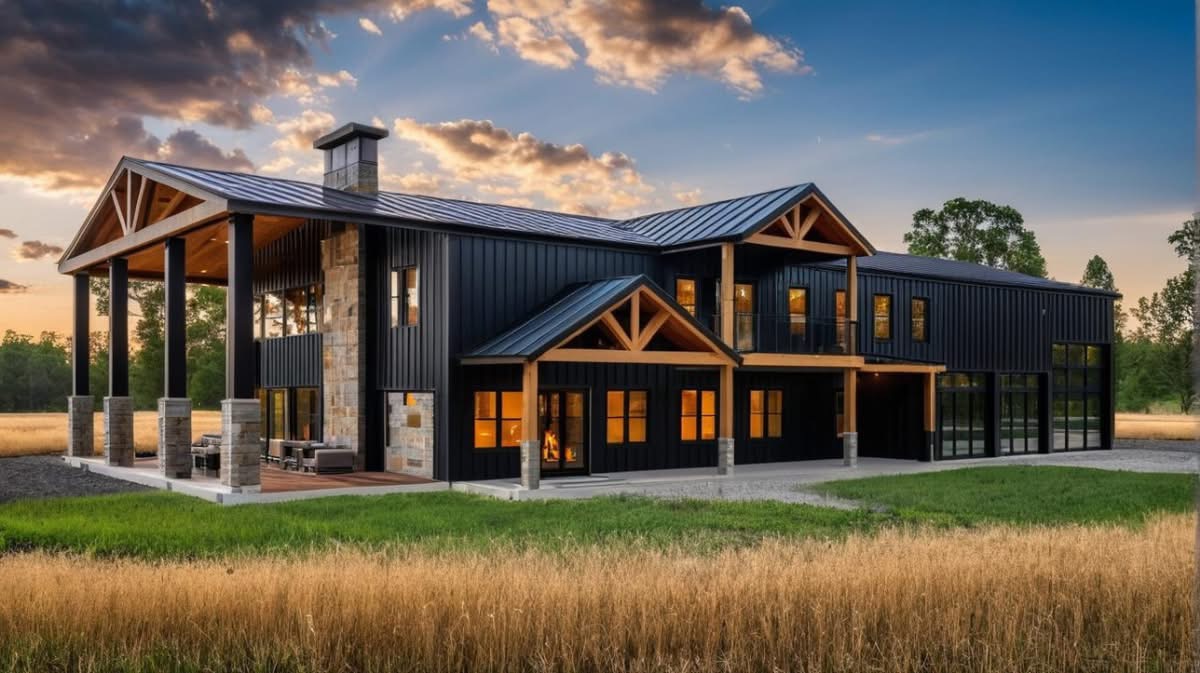 render a modern farmhouse at sunset with a black metal exterior and natural wood accents the roof is a sleek dark metal design large windows glowing with warm inviting light from inside surrounding fields are golden and green with vibrant grass the sky is a gradient of soft blues and warm oranges with fluffy clouds reflecting the sunset create a serene tranquil atmosphere with a gentle evening ambiance