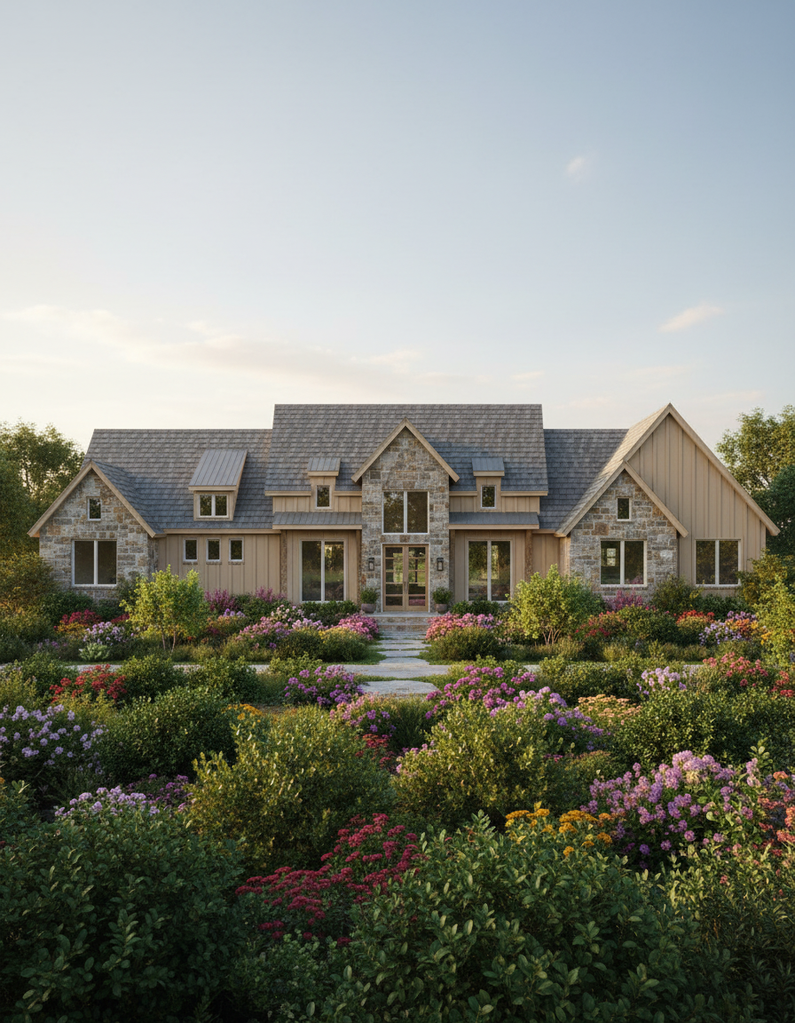 render a modern european farmhouse with white stone and wood textures the stone sections are in a warm earthy oak with subtle variations while the wood siding is painted in a soft white to complement the stone the roof is shingled in a medium weathered brown harmonizing with the structure large windows with white frames invite natural light surround the house with a lawn and landscaping the atmosphere is peaceful and inviting bathed in the golden glow of a late afternoon sun