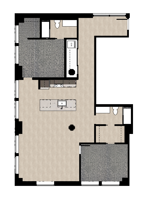 ultra realistic top view architectural render of this floor plan preserve the exact layout walls furniture placement and proportions enhance all materials with high resolution textures wood flooring carpet tile countertops and furniture fabrics add soft natural overhead lighting with clean shadows for depth improve line clarity edge sharpness and material realism maintain neutral color accuracy and avoid stylization produce a polished professional presentation ready architectural visualization with accurate furnishings in the living room and bedrooms make the bathroom tile the same as the wood tile