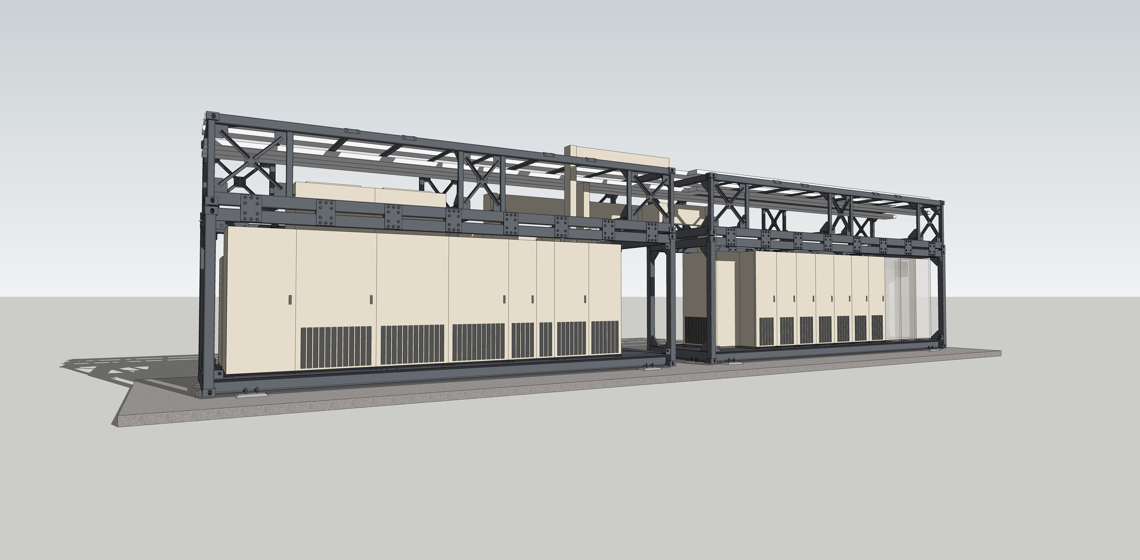 modernist exterior shot create a databank center view integrating the attached photos in rows showing overhead cabling and wireways architecture