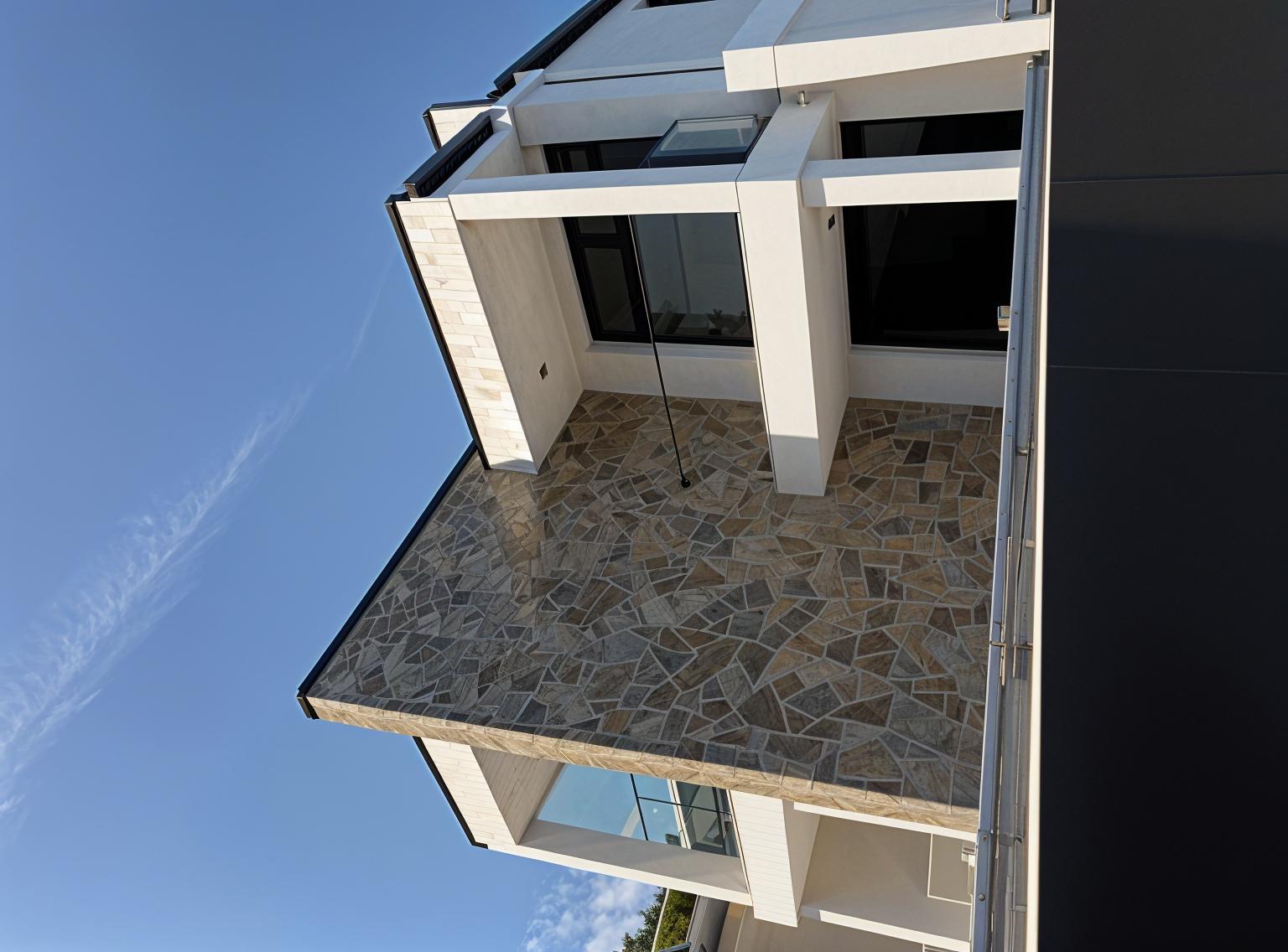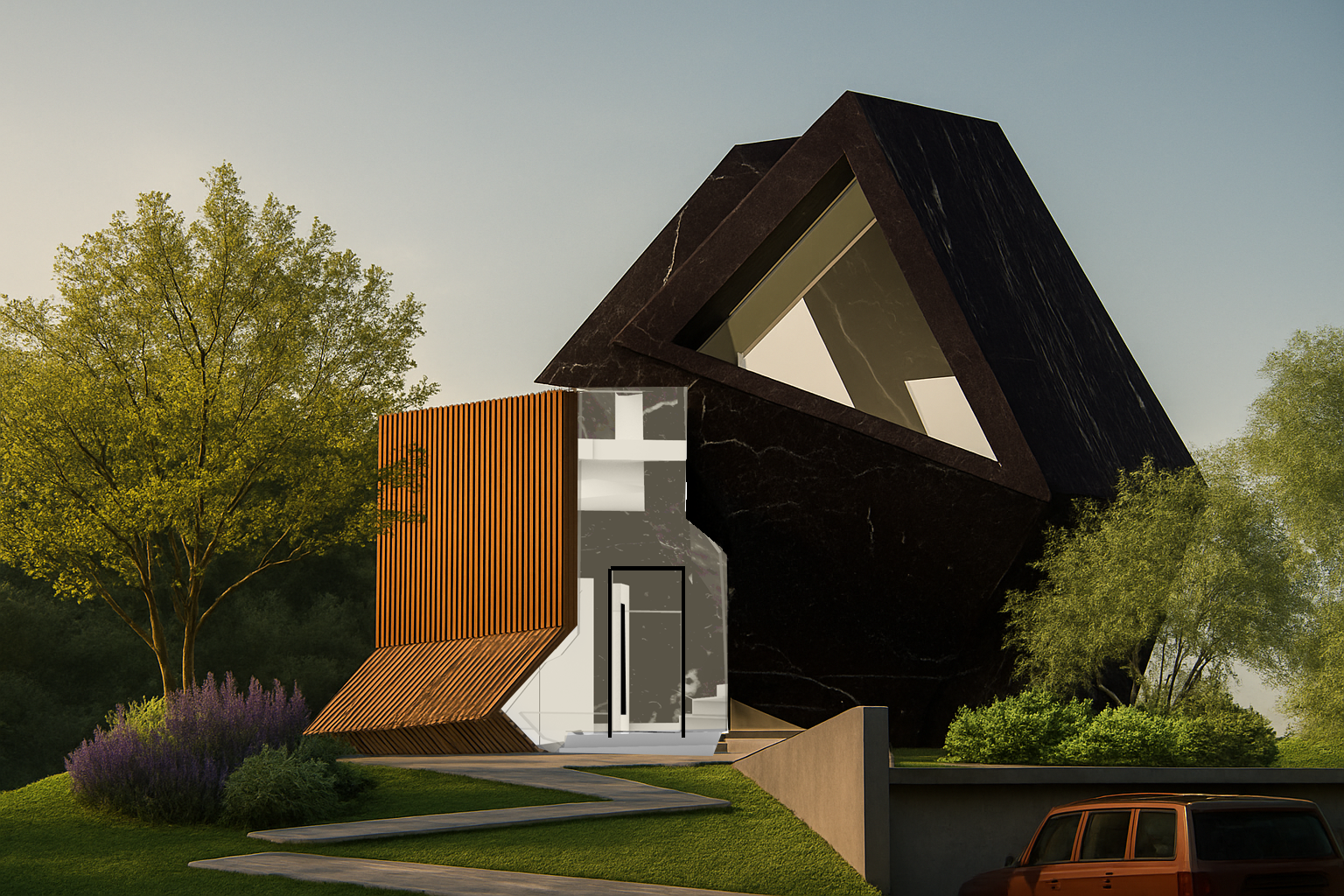 exterior shot exterior shot apply soft daylight with slight haze desaturated earthy tones and a cinematic mood emphasize minimalist composition muted colors and flat entourage silhouettes that blend graphically into the scene reduce hyper real reflections and glossiness adding subtle film grain for a photographic feel final image should feel like a conceptual architectural visualization calm atmospheric and editorial and make wall glass with reflection