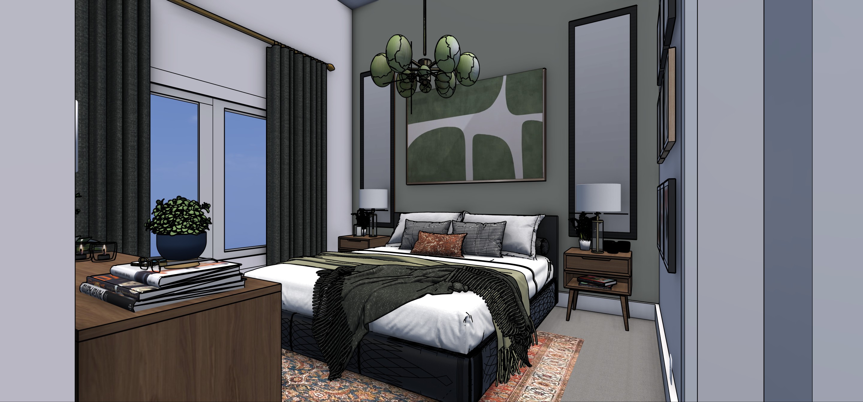 interior shot add dynamic lighting to scene moody but not too dark make the night lamps have a green glass base black mirrors on both sides of bed ontop of nightsands