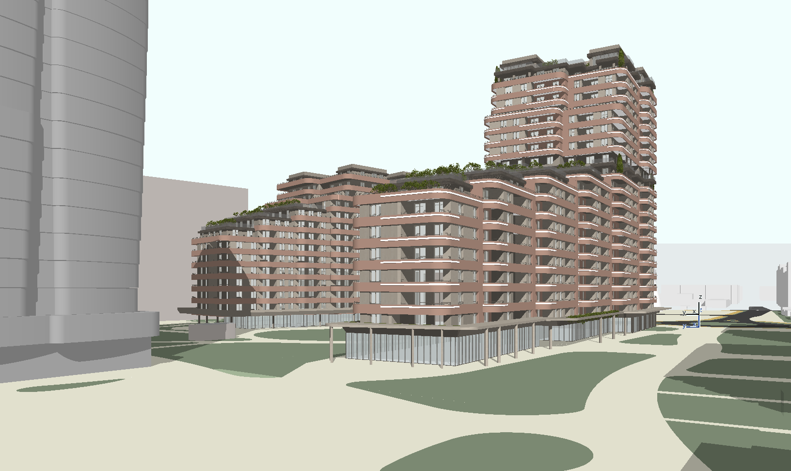 render a vibrant urban scene featuring modern residential buildings with soft terracotta hued facades incorporate lush green rooftop gardens and balconies the foreground should display smooth cream colored pathways lined with subtle forest green patches conveying an inviting natural atmosphere in the distance include sleek reflective glass buildings in metallic gray adding a futuristic touch use a clear bright sky with warm sunlight to create an atmosphere of serenity and modern elegance