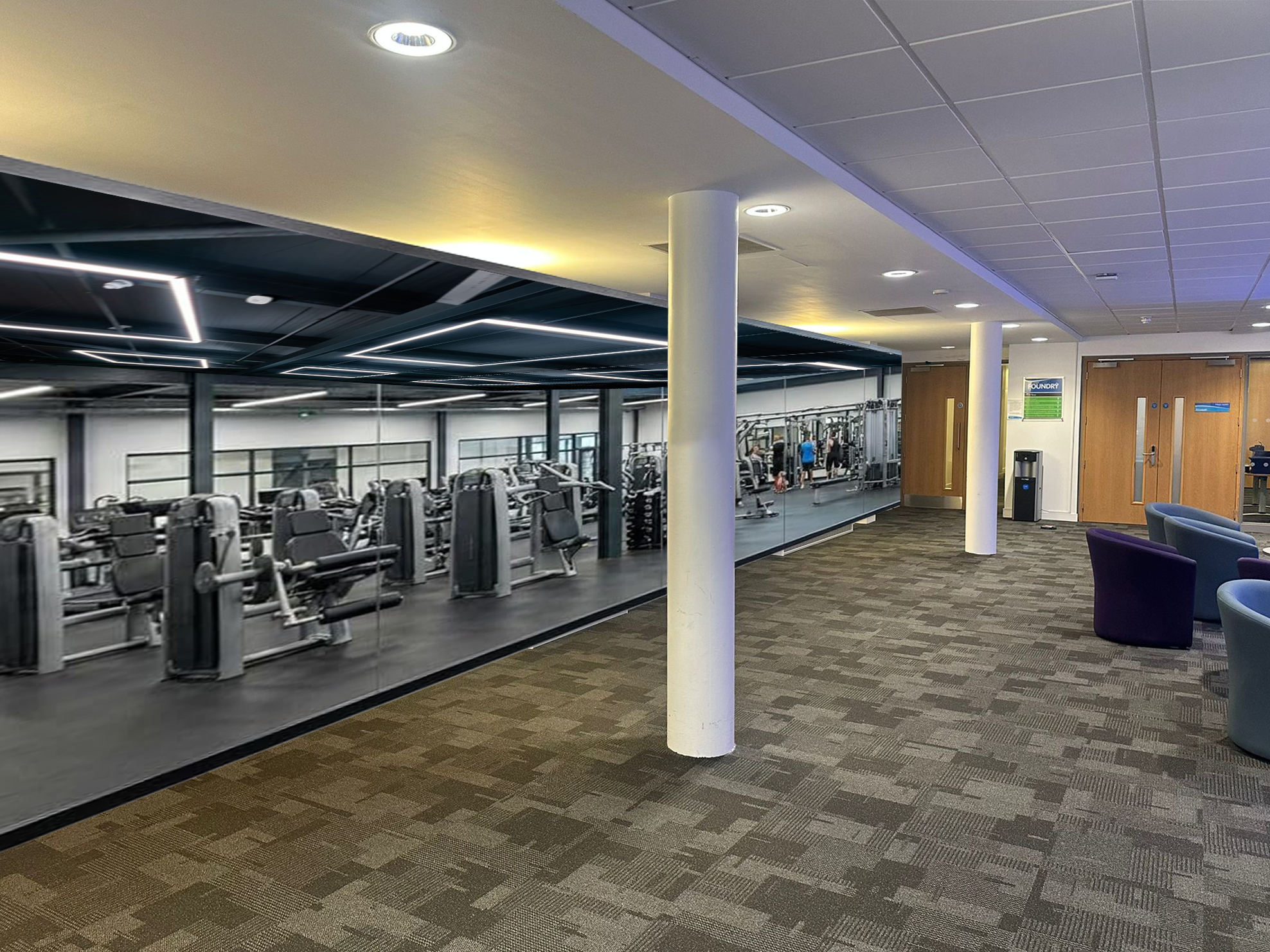 photorealistic architectural render of a modern interior space with full height glass curtain wall transparent glazing with realistic reflections looking into a contemporary gym interior visible gym equipment including treadmills and weights clean and well lit fitness space polished concrete flooring neutral tones soft natural daylight realistic shadows and reflections on glass seamless integration between spaces eye level perspective ultra realistic high detail architectural visualization global illumination