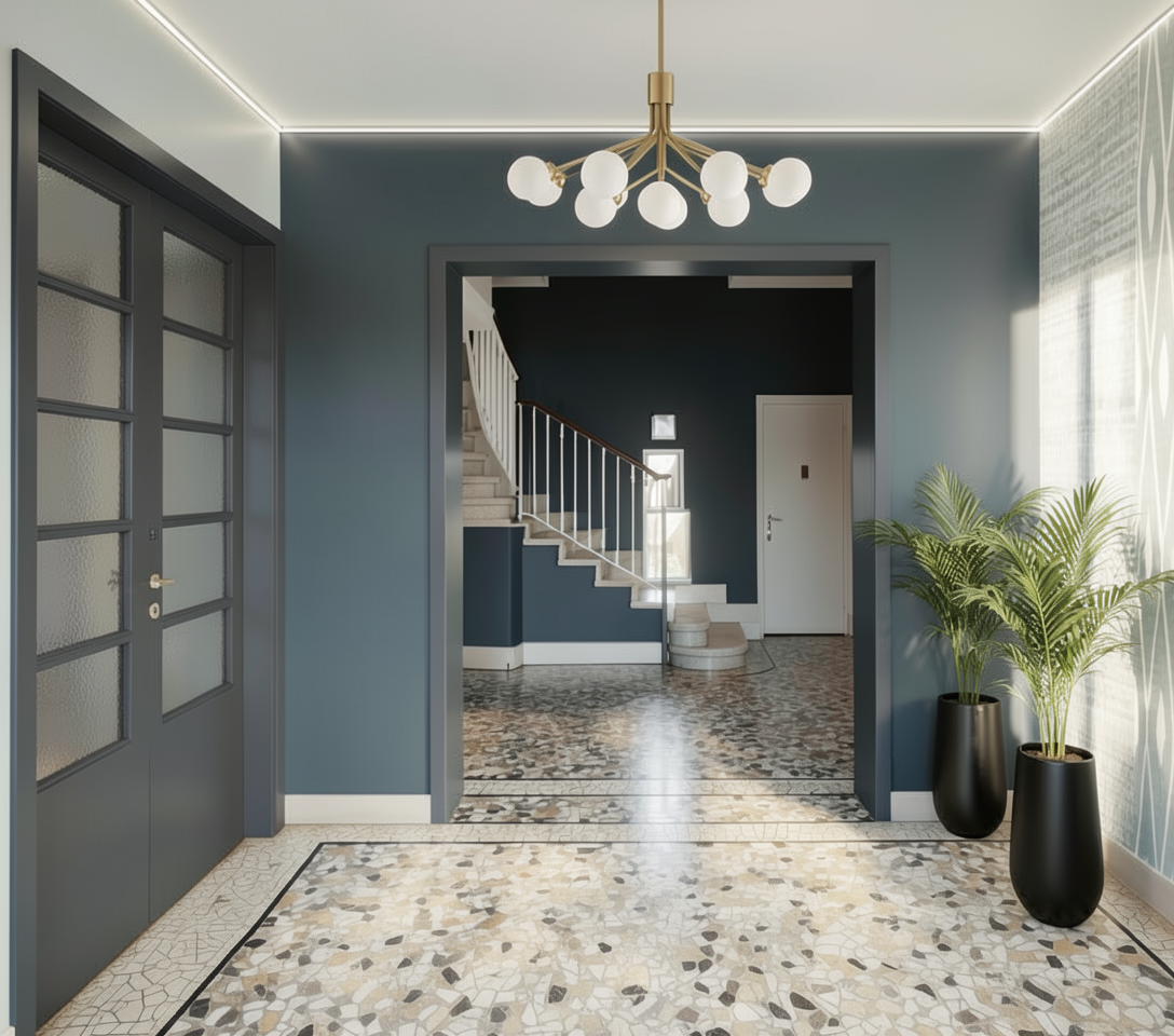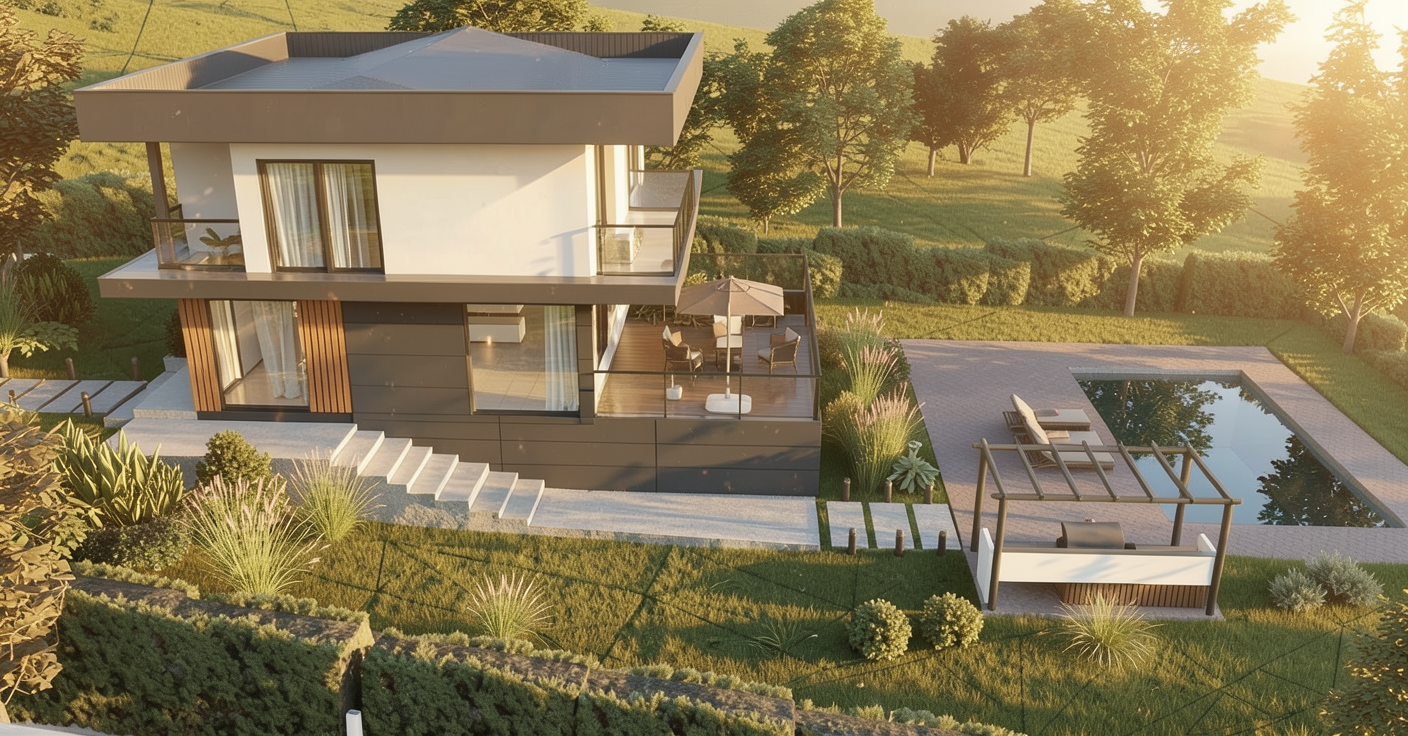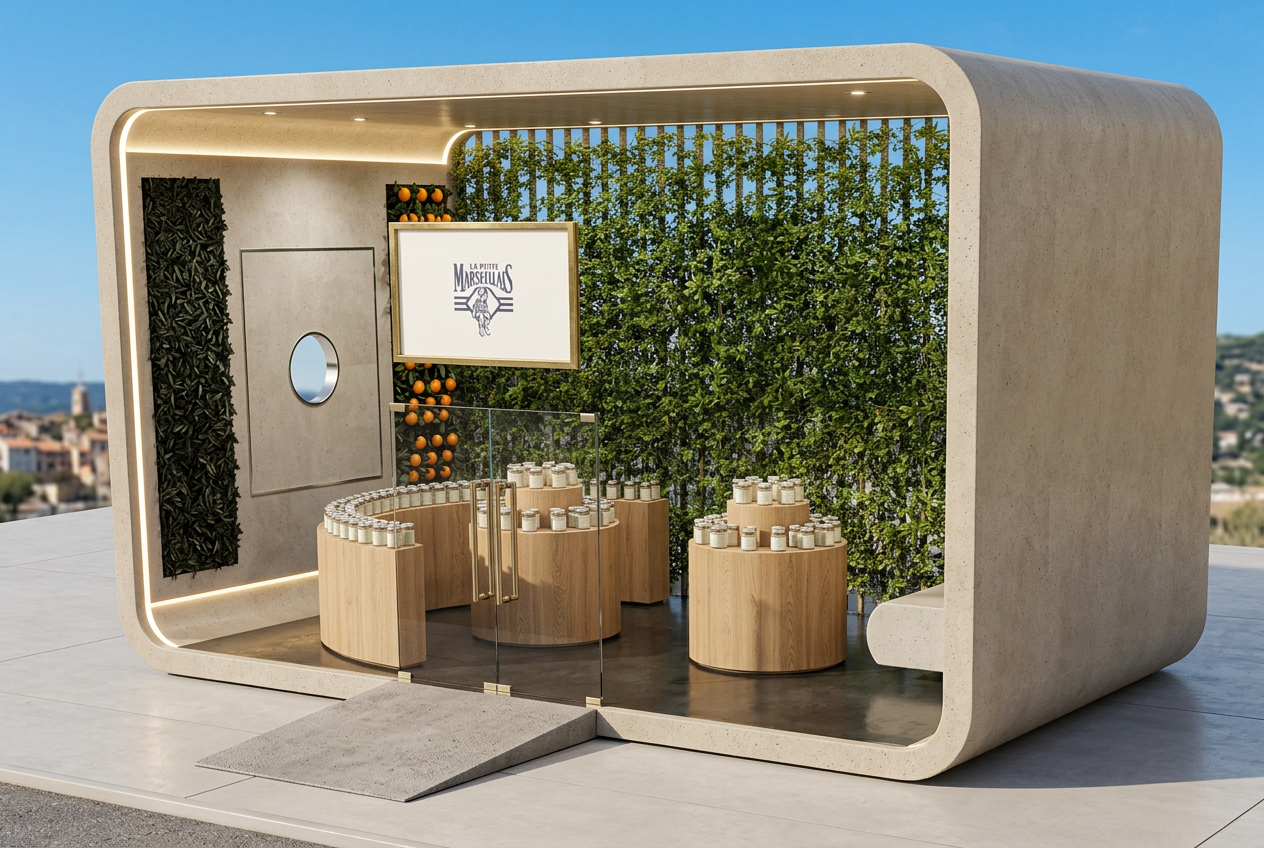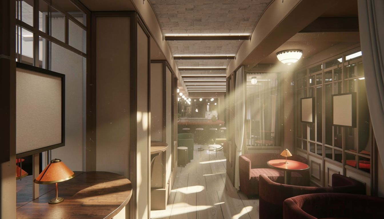 add small retail vignettes under the green ceiling clouds do not change any design elements of the original image