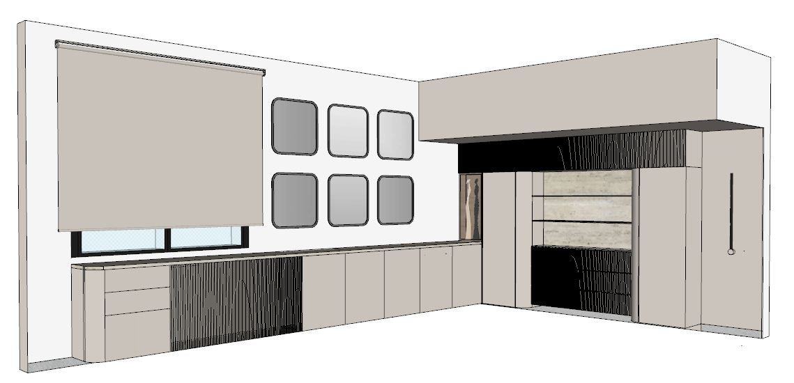 keep materilas as in picture the ones that look shaded black are fluted wood the sqaures on wall are mirror with black frame and the 2 shelves are glas tinted