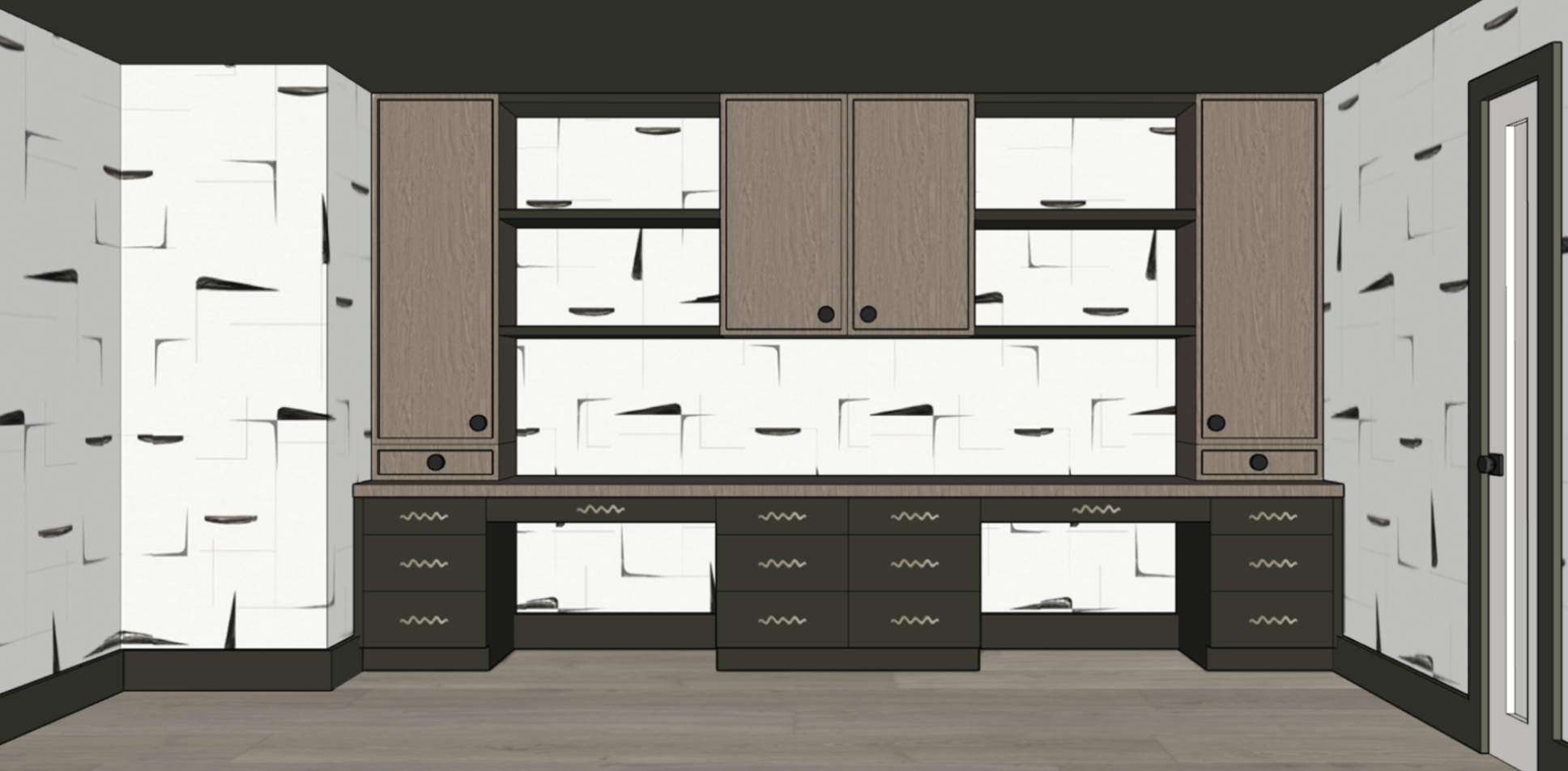 a fun homework room with llight natural white oak upper cabinets and dusty green painted lower drawers the walls have a fun black and white wallpaper