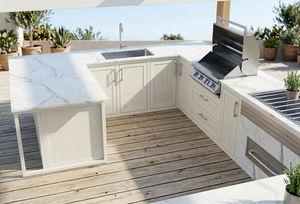 the frame colour of the cabinets needs to be hex colour efeee5 in a matt powder coat the wood panels inside the doors need to be an off white with small flecs of gray the doors need to include the outdoor frame colour the floor needs to be a natural decking