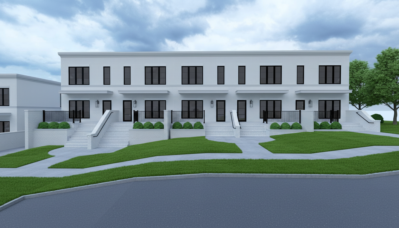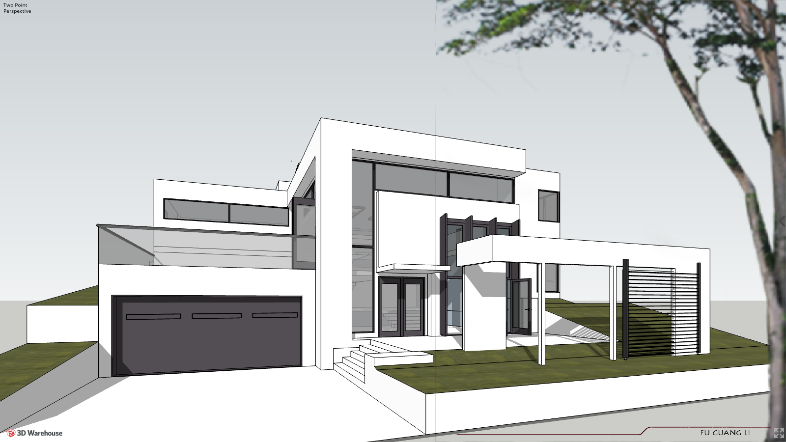 luxury modern landscaping with wide stone paved driveway lush green grass structured hedges tall slim trees flower beds with white gravel water feature near entrance and accent outdoor lighting harmonize with sleek modern villa design