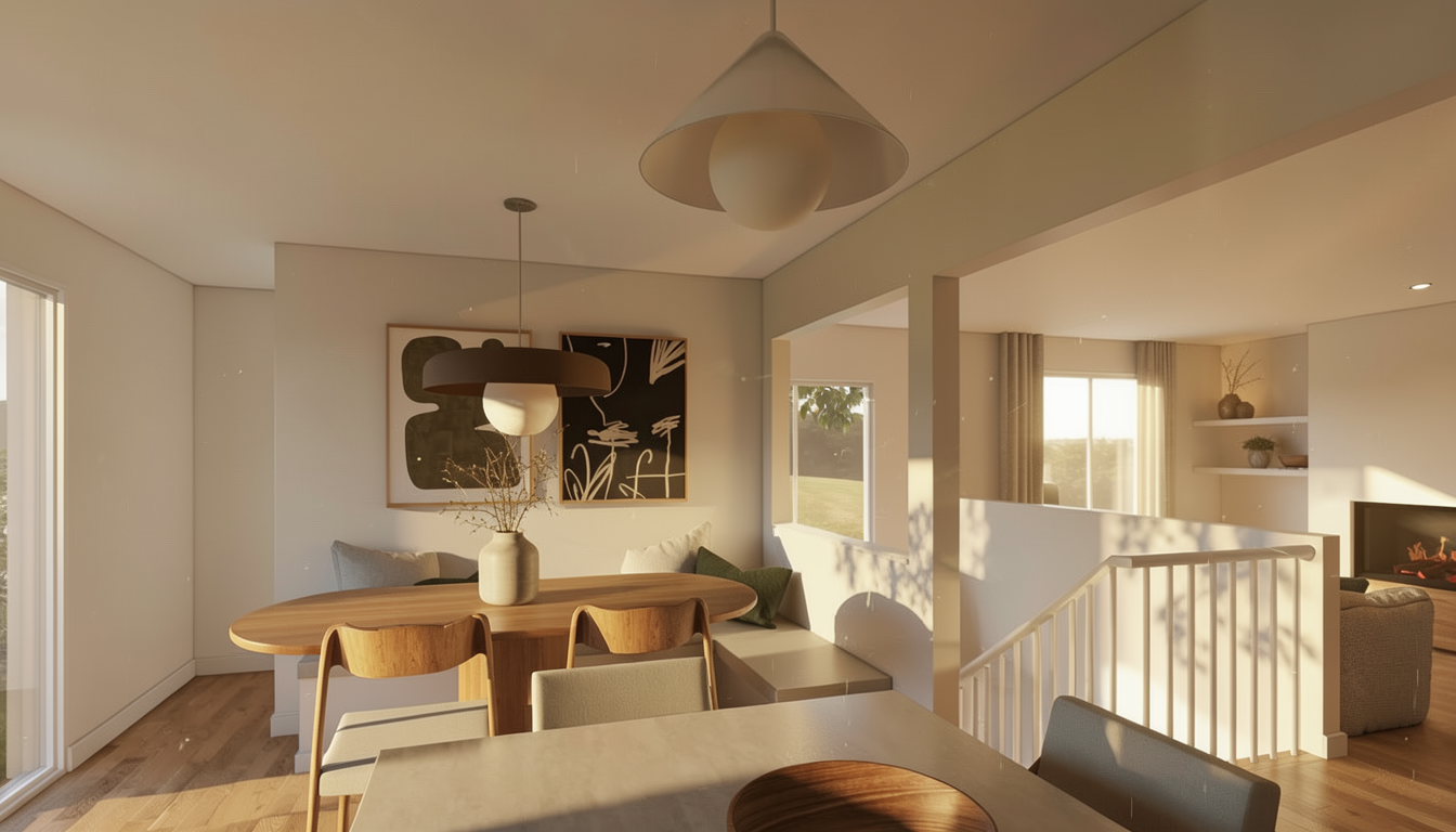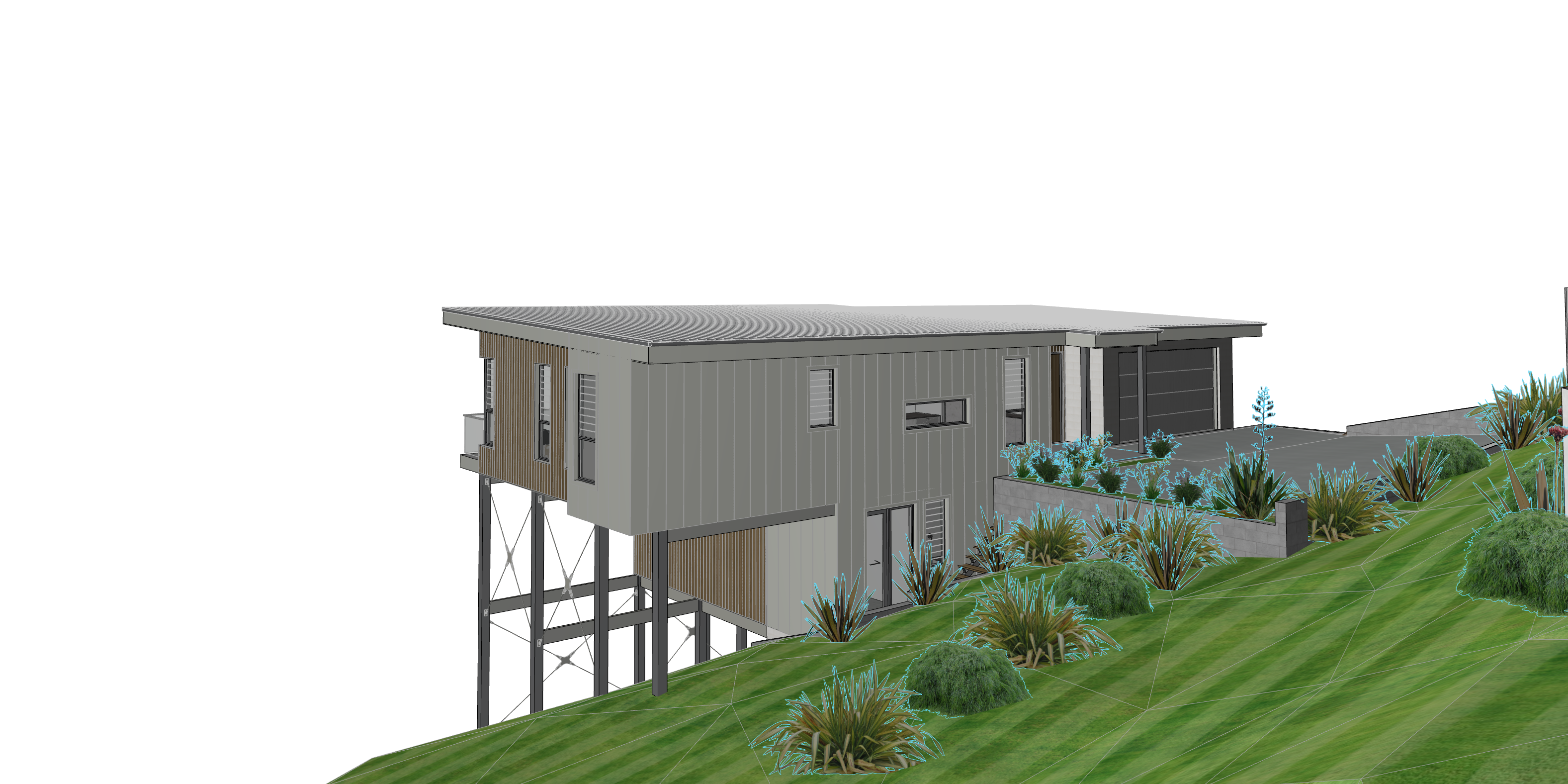 render a photorealistic 3d perspective of this house in cairns queensland australia reference the current material style just enhance them keep model geometry the same windows doors roof walls garage door pavement driveway make a lush vegetation that looks native to cairns do not change the view only enhance the current materials and make the landscape nicer vegetation house overlooks a very dramatic afternoon setting in tropical hinterland hills with the pacific ocean distant down below detailed textures in the wood siding and fc siding and glass reflections and a vibrant clear sky with light atmospheric depth render in hyper realistic architectural visualization quality 8k resolution