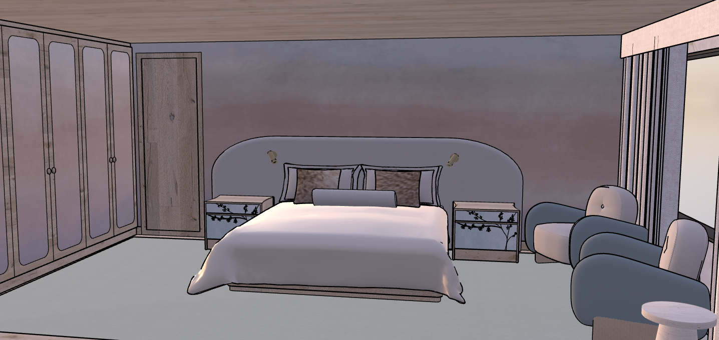 render the space in hyper realistic visualization quality at 8k resolution keep the room exactly as shown with all existing textures and materials unchanged the ceiling are wood the panels on the closet and the wall behind the bed is a colorful gradual gentle pastel paint the overall image should feel realistic calm and natural with accurate lighting and material texture