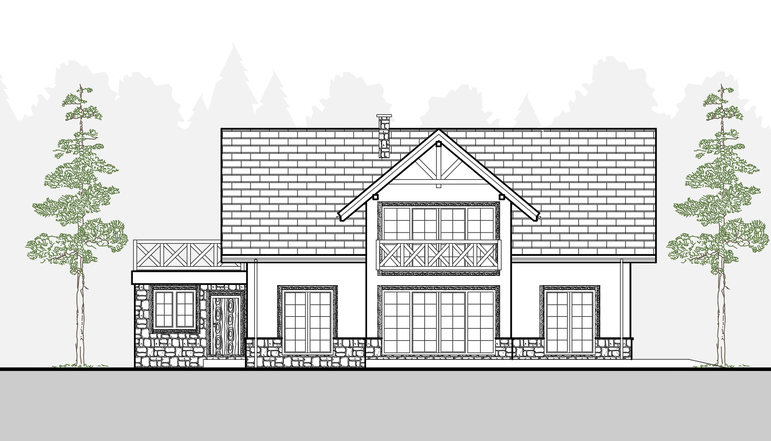 stone plinth black shingle roof wooden windows with glazing bars wooden window trim wooden doors wooden garage door beige plaster balcony and terrace with wooden balustrade black gutters and downpipes golden oak color of all wooden elements