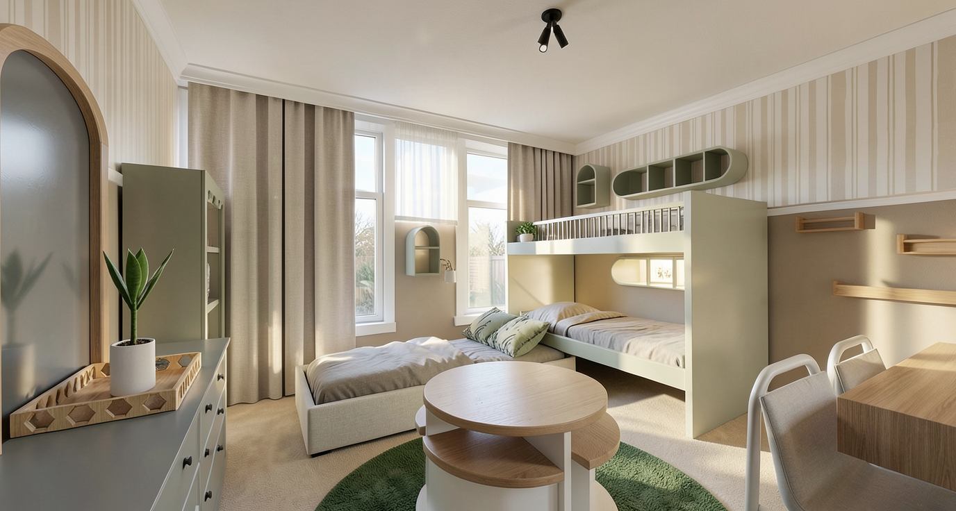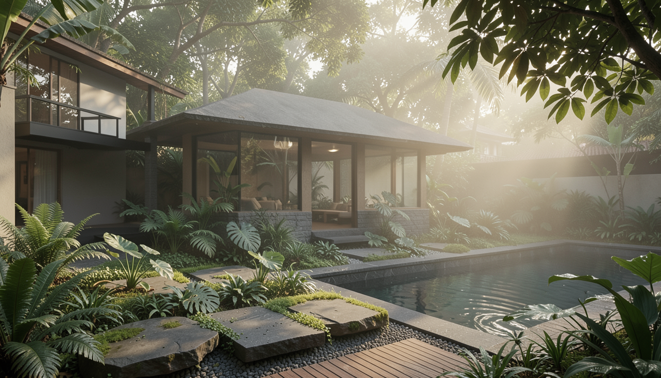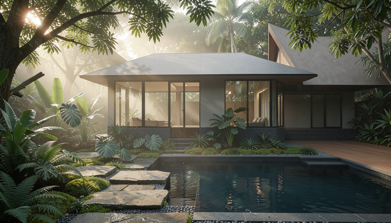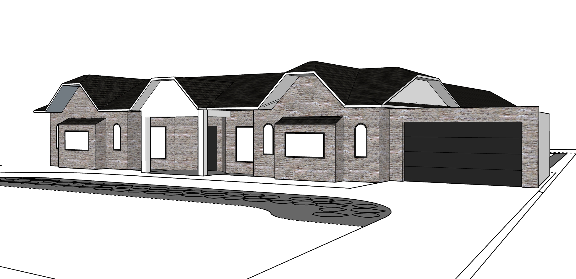 brick house with circular drive around a rock retaining wall with bushes and greenery