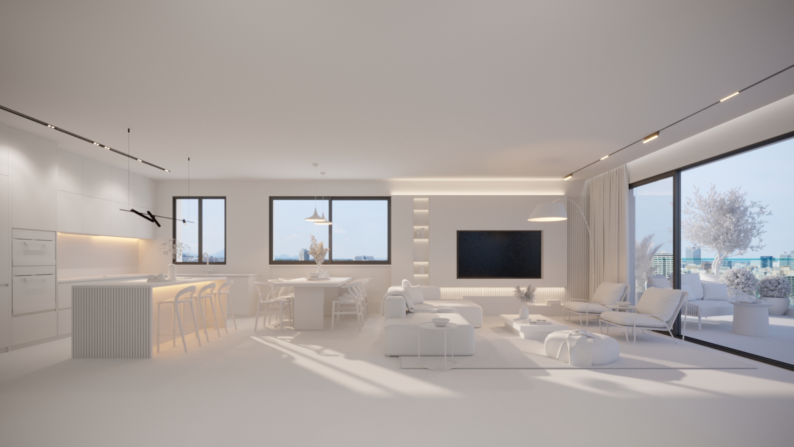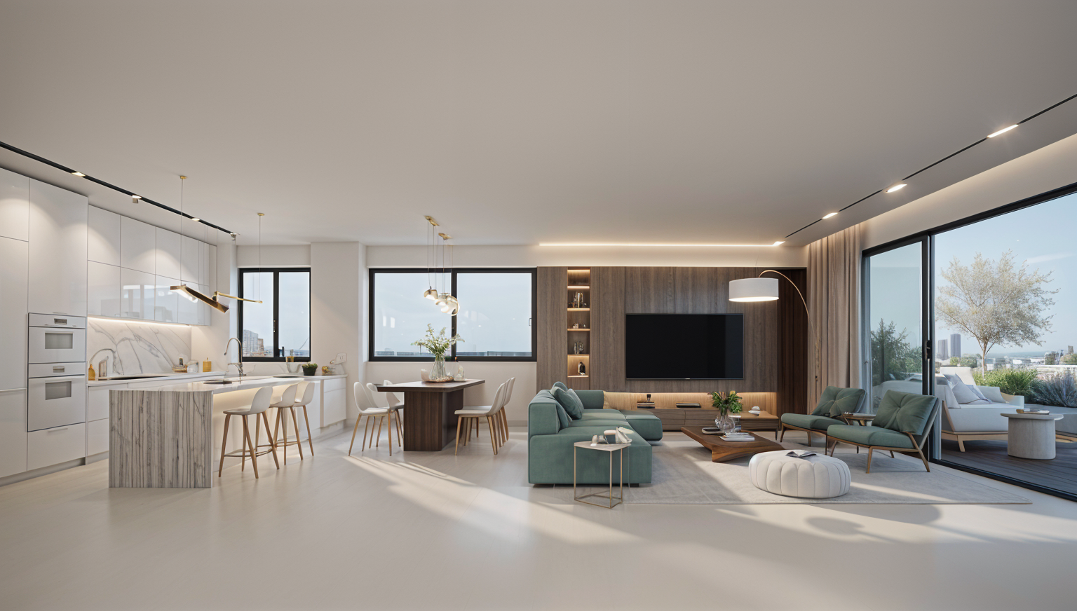 new urbanism interior shot modernist interior shot render a modern dining and kitchen area with a sophisticated and luxurious atmosphere use a soft warm ivory for the dining chairs and barstools to create a cozy appeal the dining table should be an elegant deep espresso brown giving it a rich look decorate the overhead chandelier with golden accents for a touch of luxury and a gentle warm glow the walls should be finished with a combination of matte white and textured gray panels for a contemporary feel incorporate a wooden partition with horizontal slats in dark walnut to balance the open space the kitchen counter should feature a sleek marble surface in a blend of whites and soft grays complemented by stainless steel fixtures for a modern touch use recessed ceiling lights and pendant lights in black and gold to provide soft ambient lighting add subtle green plants and metallic decor items on the shelves for a hint of color and style the overall atmosphere should be a mix of modern sophistication and inviting warmth in the living room infront of the tvtheir is a low and small coffee table in the kitxhen the oven is black out side in the balcony the deck is made out of brown wood and the plants are green and flowery the sofa is in pistacio green colors architecture