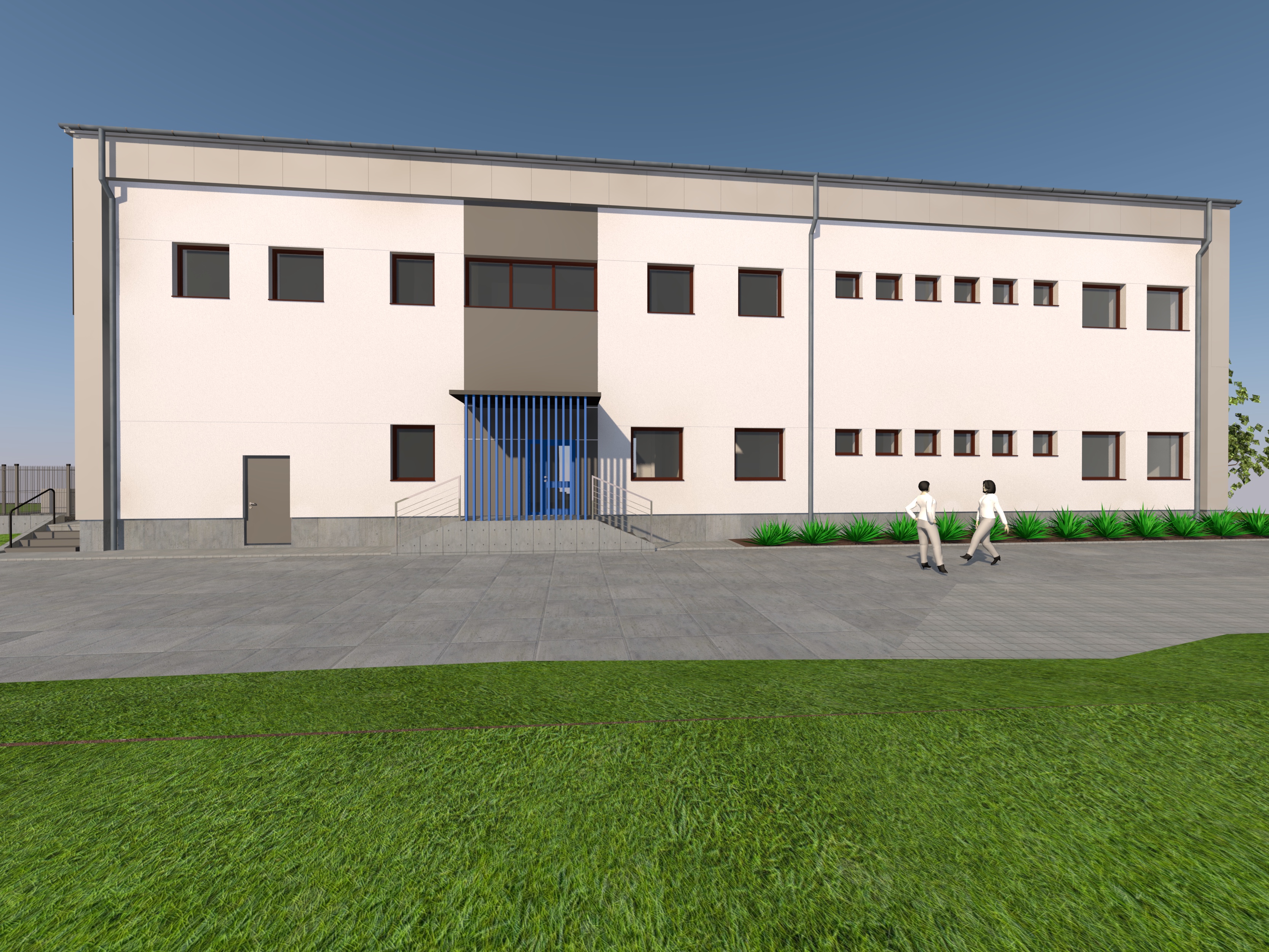 exterior shot nice asphalt road lots of blue posts at the entrance nice shiny gutters pretty women architecture