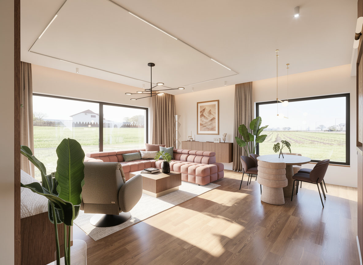 enhance this render to ultra photorealistic quality while strictly preserving all existing geometry materials and design apply high end architectural photography post processing balanced exposure natural white balance improved contrast and realistic dynamic range introduce soft global illumination effect and subtle light falloff for depth lighting refinement simulate natural daylight with soft shadows and gentle gradients slightly directional but diffused overcast sky enhance ambient occlusion in corners and contact points add subtle photographic effects mild depth of field realistic lens response slight bloom on highlights and very light film grain material enhancement no changes improve perceived realism through micro contrast texture clarity and natural roughness variation without altering colors or finishes tone mapping cinematic soft contrast no blown highlights no crushed blacks final look high end interior photography clean natural and believable not stylized not cgi