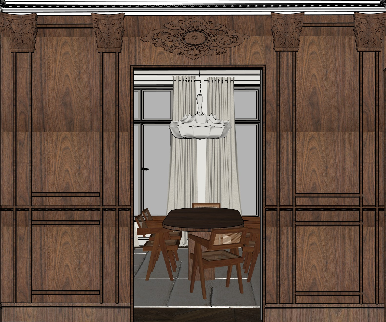 the apartment is on the 3rd floor of a parisian building the walls with millwork are in walnut the chairs are pierre jeanneret chandigarh chairs in walnut like this https www chandigarh design com fr fauteuils le corbusier 10 fauteuil de bureau pierre jeanneret le corbusier html the rug is in light beige the pendant light should be less white and more warm in color