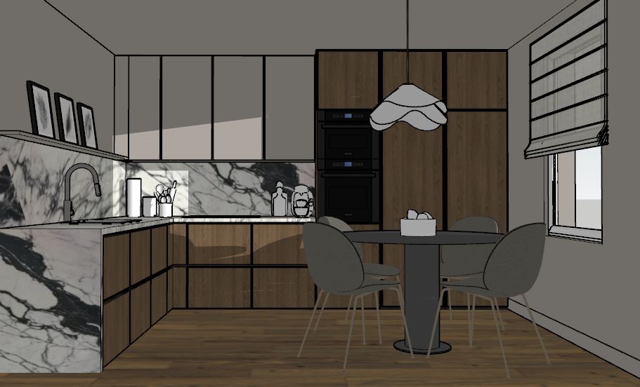 type of image hyper realistic architectural interior render editorial style scene framing interior kitchen dining space based exactly on the provided sketch same camera angle same perspective same proportions and layout do not reinterpret the design floor wooden flooring in strip pattern alistonado medium dark tone similar to walnut natural variation between planks matte finish no gloss subtle texture slightly worn realistic kitchen cabinetry lower cabinets tall units fully finished in natural walnut wood medium dark warm tone vertical grain clearly visible cabinet doors with subtle vertical relief integrated carved finger pull u ero tallado matte finish no varnish shine upper cabinets flat panel cabinets in light grey color matte finish smooth surface no texture clean and uniform appearance countertop and backsplash porcelain marble m rmol porcel nico white base with strong natural veining matte finish slightly rough texture not polished no reflections shelf balda same material as marble backsplash thick solid appearance matte finish clean edges walls painted in light neutral tone warm white very light grey matte finish smooth surface no texture window blind estor off white linen fabric semi transparent soft folds natural textile texture light filters through dining table round table in brushed stainless steel top thin matte metallic finish central pedestal smooth cylindrical shape same brushed steel base circular metal plate flat thin clearly defined subtle reflections not mirror like chairs structure legs in brushed stainless steel seat and backrest upholstered in dark grey fabric matte finish real textile texture tense fabric not inflated coffee area important black coffee machine inside a small white porcelain espresso cup with handle resting on saucer clearly a cup not a jar or glass next to it wooden cutting boards natural wood medium tone visible grain decor objects minimal kitchen accessories in white porcelain natural wood lighting natural daylight entering from window soft indirect light no artificial lighting added no led strips atmosphere neutral calm realistic no stylization beyond realism quality photorealistic high detail physically accurate materials restrictions do not change layout or proportions do not redesign furniture do not add objects do not change materials no glossy finishes unless specified no plastic appearance