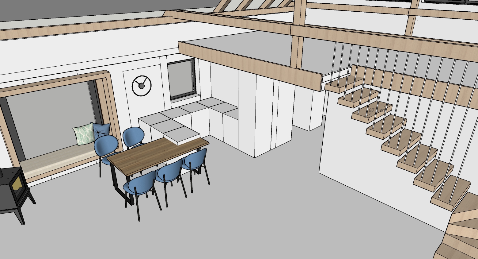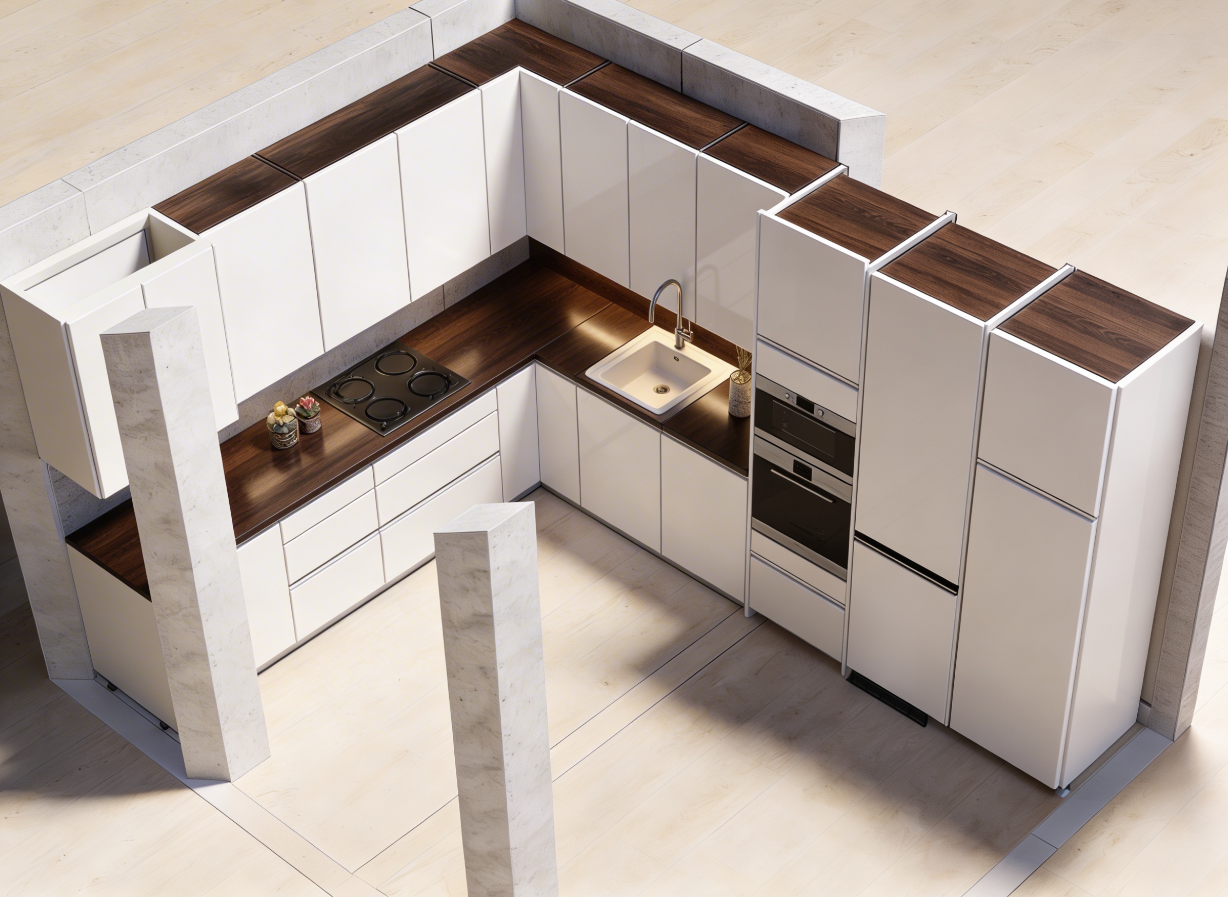 make a photo realistic picture raise the kitchen in white add lights floor woden