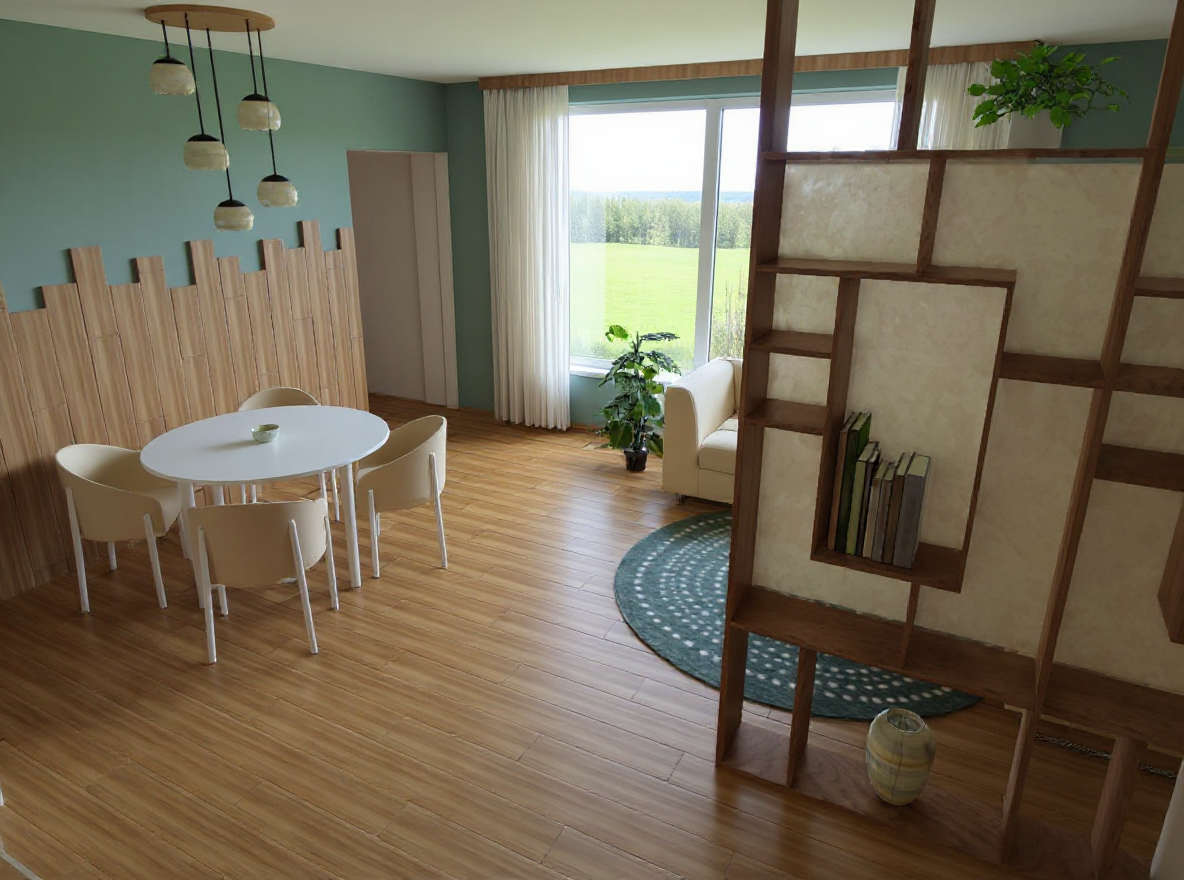 render a modern traditional kitchen with teal island white beige sink cabinets and wood tall cabinets wood floor and sunny bright atmosphere