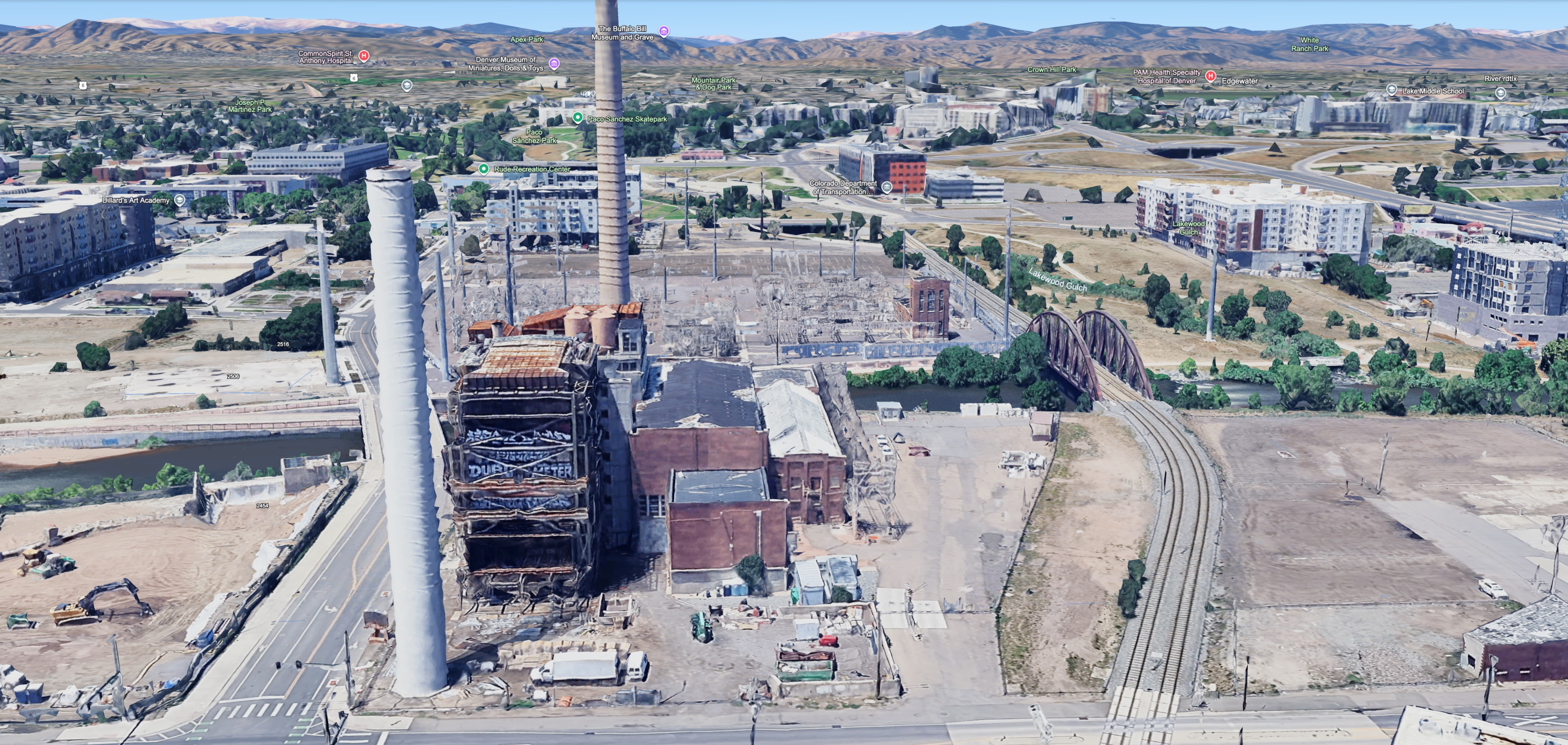 infill all 2 5 acre site include stack into development as elevator stairs with windows model industrial cultural campus riverfront both sides of river development like cheslea market highline power station london plantings consistent to rocky mountain region