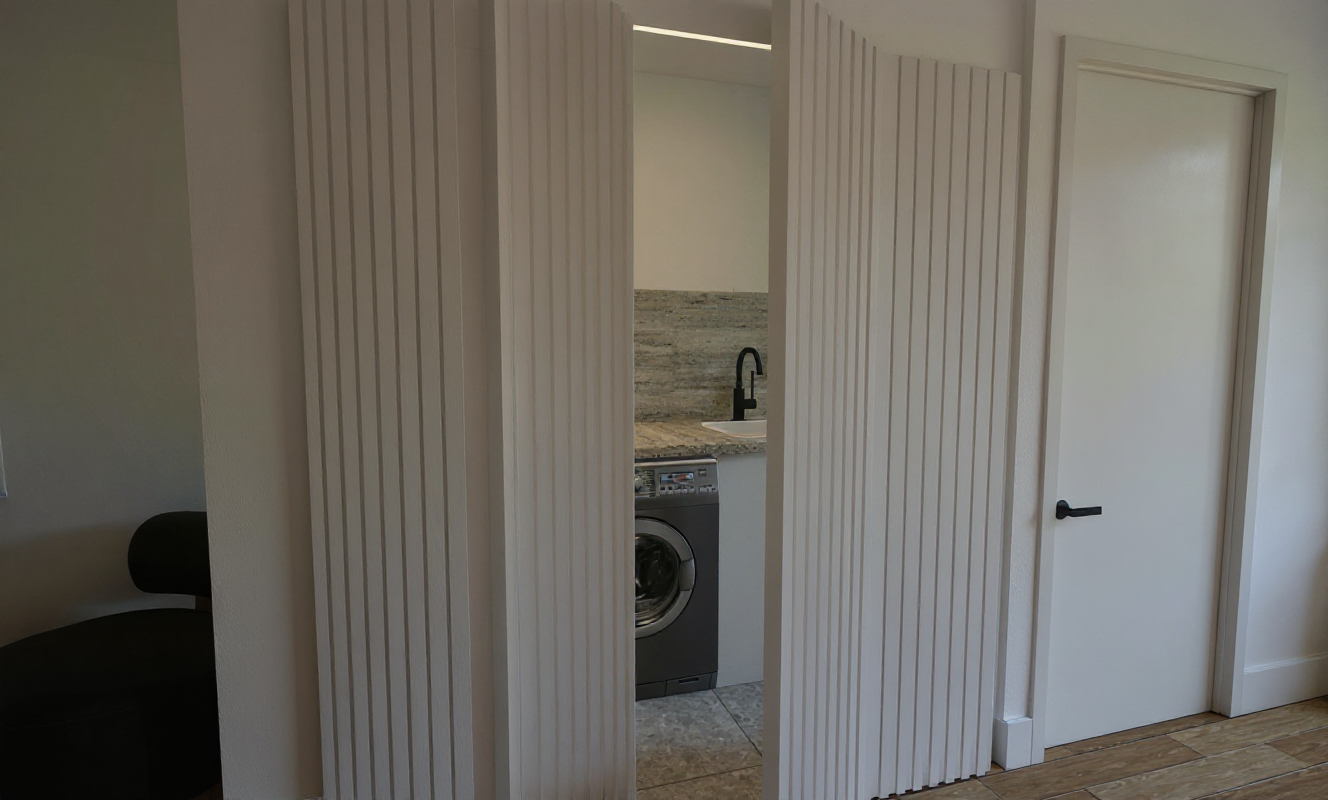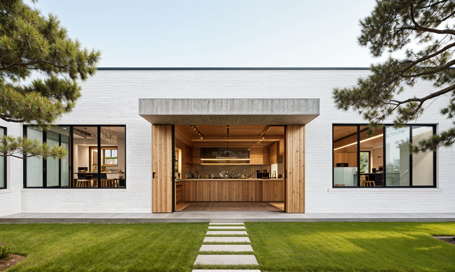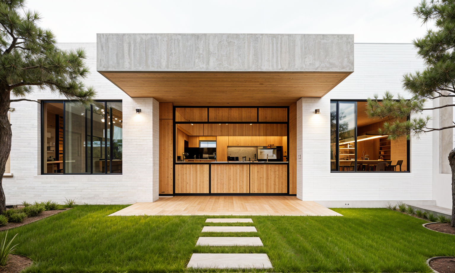 modern style cafe center entrance canopy is modern full wall finish white brick plywood finish on the wall in the middle frame black center facade canopy concrete place cafe bar counters deep inside counter concrete remove the arch removal of the roof the front garden has grass and center stepping stones remove the arch removal of the roof tiled roof removed place pine trees on both sides of the outside the window is a fixed window
