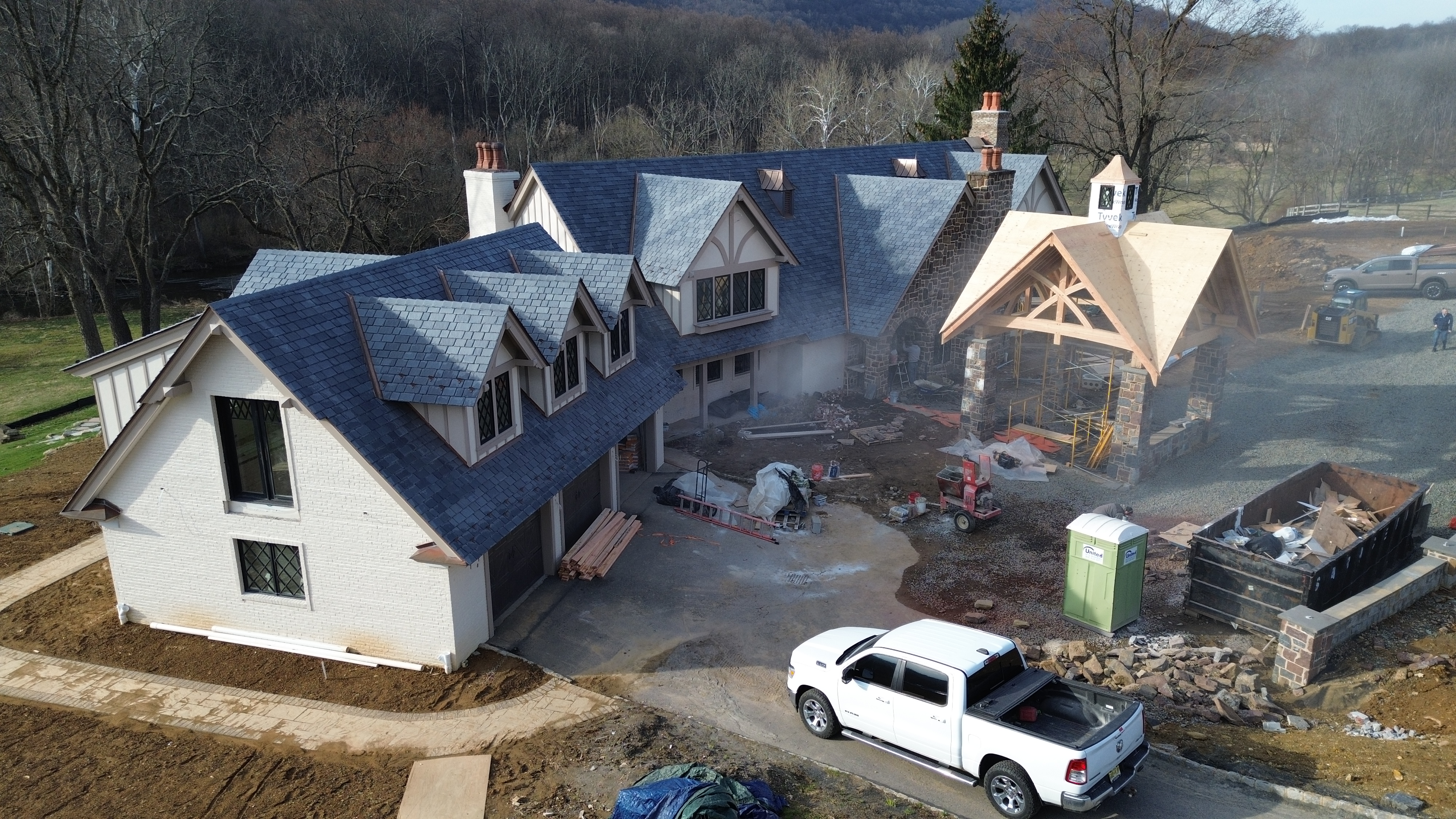 remove all construction debris and vehicles put a slate roof on the portico in the front put a copper roof on the cupola on top of the portico finish the driveway to be paved and go under the portico and put nj east coast land scaping around