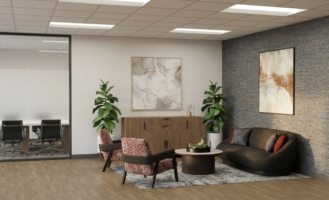 render photo realistic keeping all finishes and structure the same keep frosting on conference glass ceiling is standard office grid with 2x2 direct indirect led lights drywall ceiling in conference room