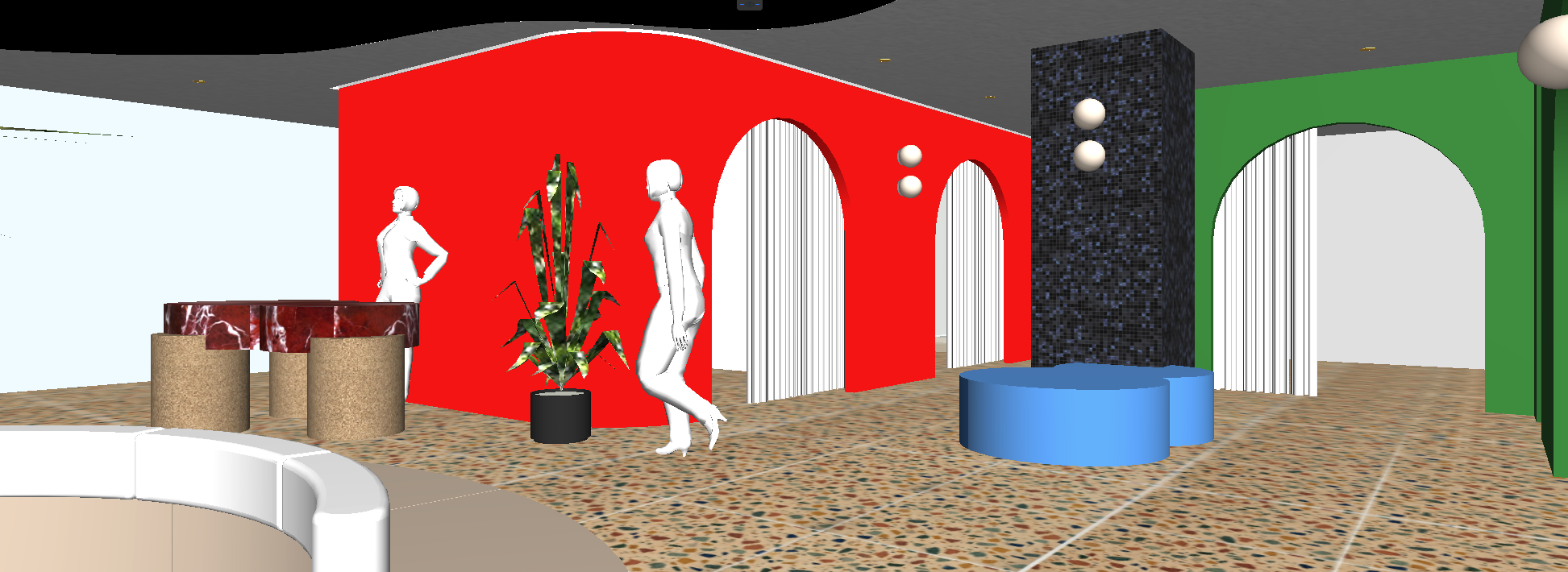 replace the flush black round ceiling texture with a flush warm illuminated barrisol stretch fabric light this should read as flush with the ceiling replace the red walls with amber transparent glass brick blocks for the round table legs in front of red wall show these as sandstone texture replace the green walls with a dusty red brown paint trowel texture replace the current plants with realistic lush looking indoor plants in the same location dont add more ensure the current terrazzo floor looks realistic show hidden recessed warm lighting channels where walls intersect with the ceiling replace 2 x current people with 2 x real life looking females ensure round wall lamps are subtly illuminated overall lighting should be subdued and suitable for a day spa however not too dark show the blue circular ottoman as a beige ottoman show the curved sofa that is on left as a brown leather sofa