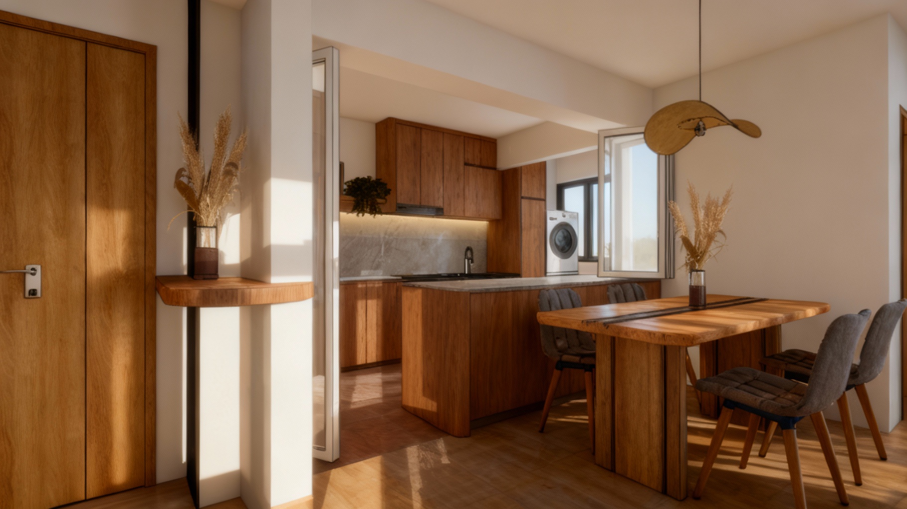 render this picture to look more realistic its on the 4th floor so you can see some buildings outside light comes through the windows the wall cabinets are white