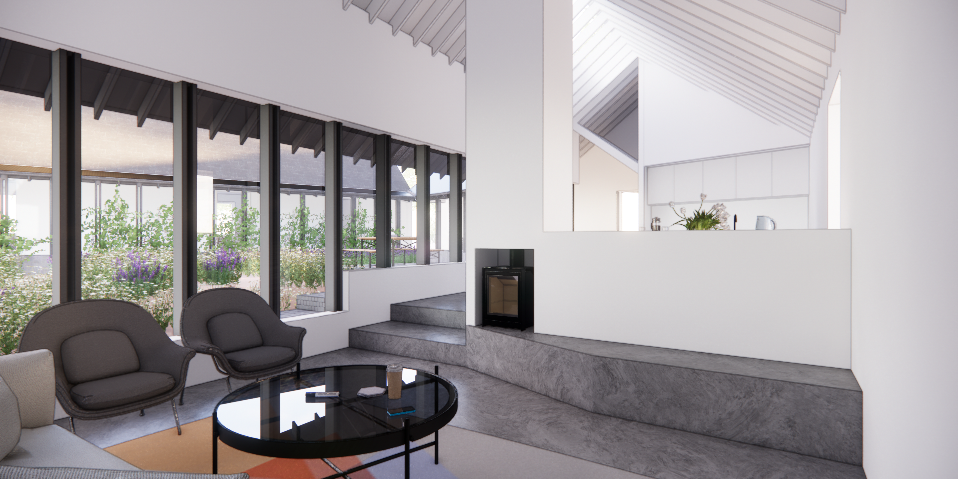 modern interior person sitting on cushion beside stove