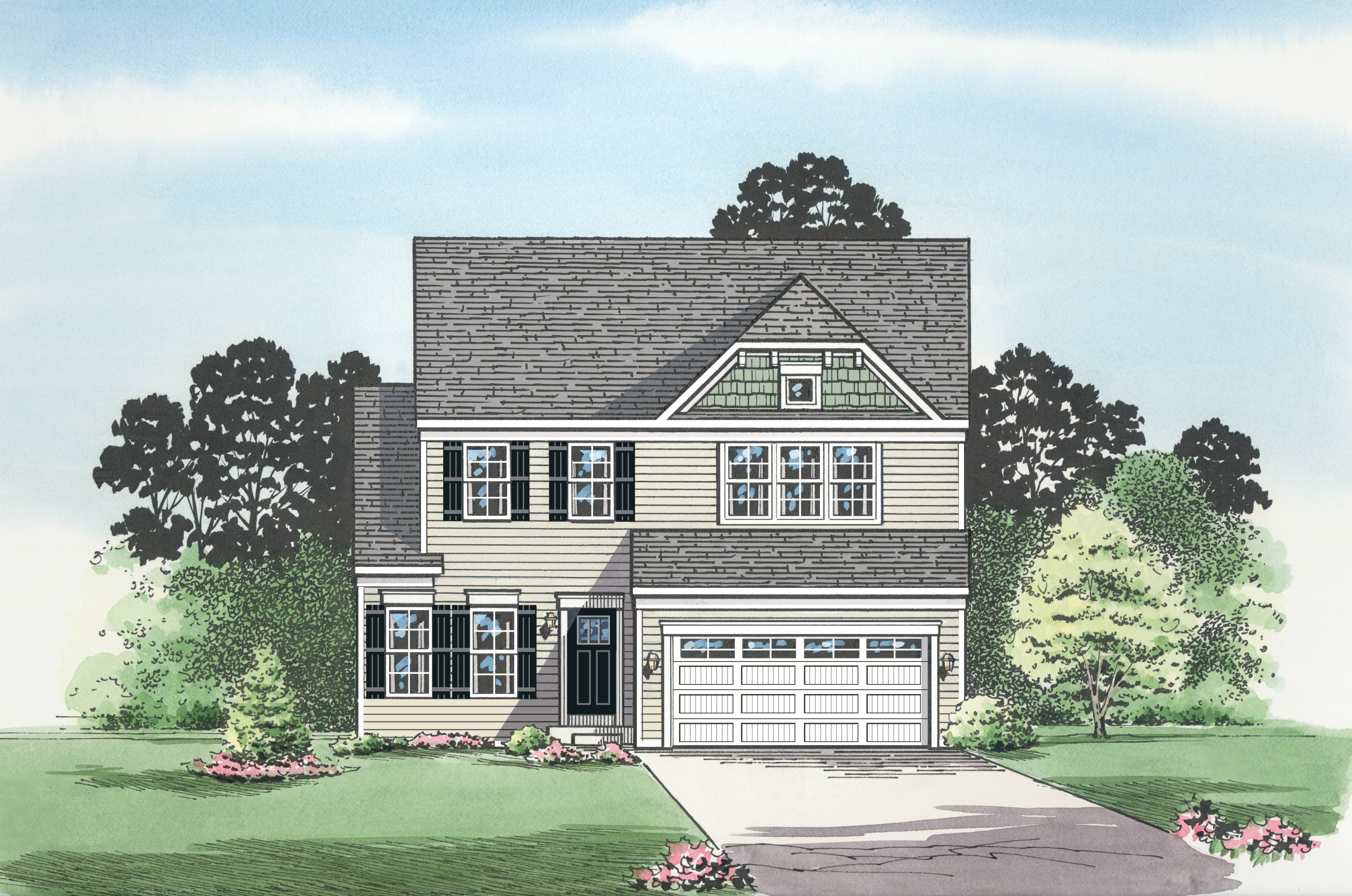 convert this architectural elevation into a photorealistic image of the exact same house preserve 100 of the original design proportions rooflines window placement trim details and layout do not add remove or modify any architectural elements apply realistic materials horizontal vinyl siding in light beige white trim dark shutters asphalt shingle roof and a painted front door maintain the existing garage door design and window grid patterns use natural lighting with soft daylight shadows realistic landscaping consistent with a suburban setting and true to life textures keep camera angle straight on elevation view no stylistic reinterpretation no modern redesign no changes to structure photorealism only