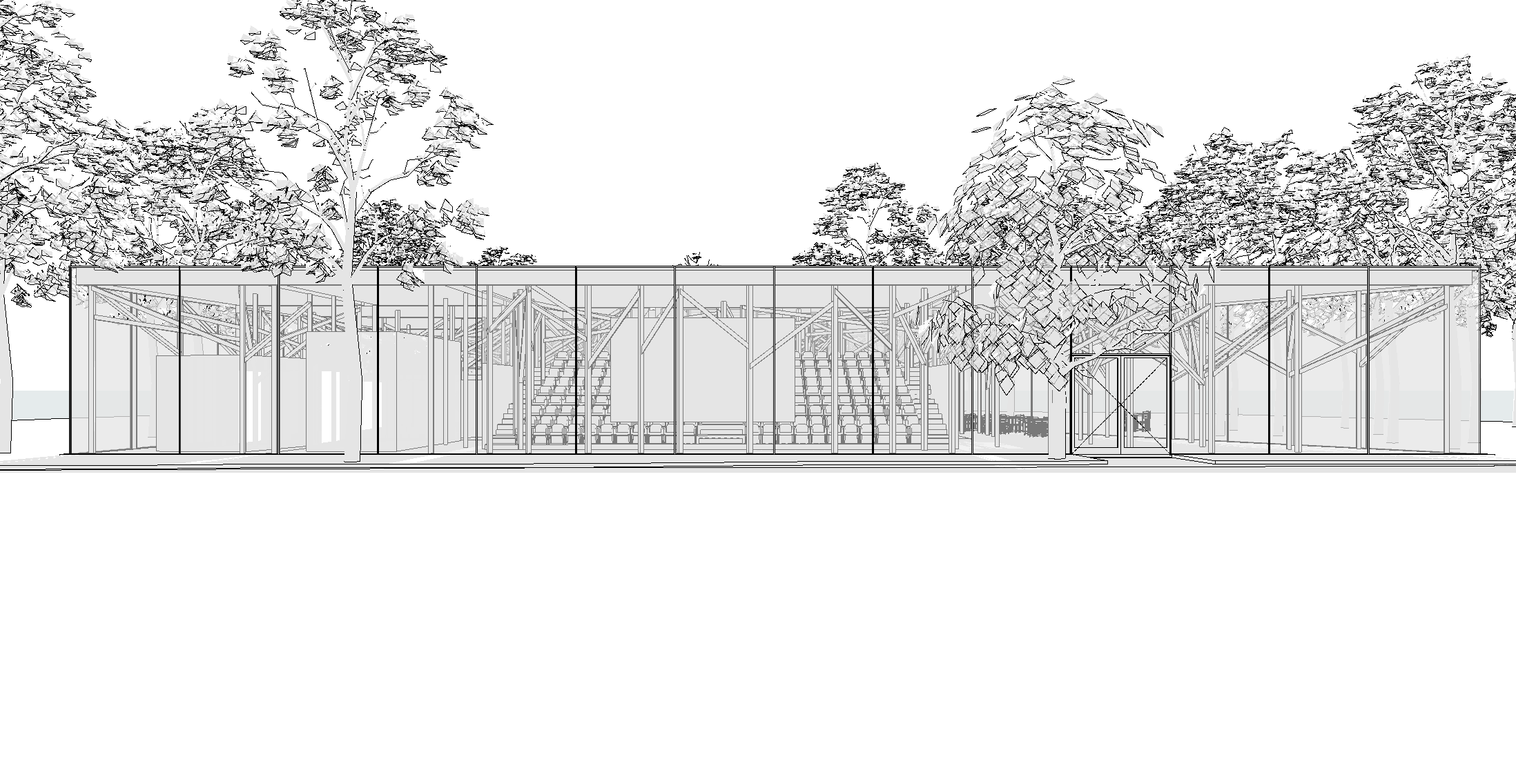 big glass building in the middle of the forest wooden glue lam pine construction inside white boxes in polycarbonate architecture