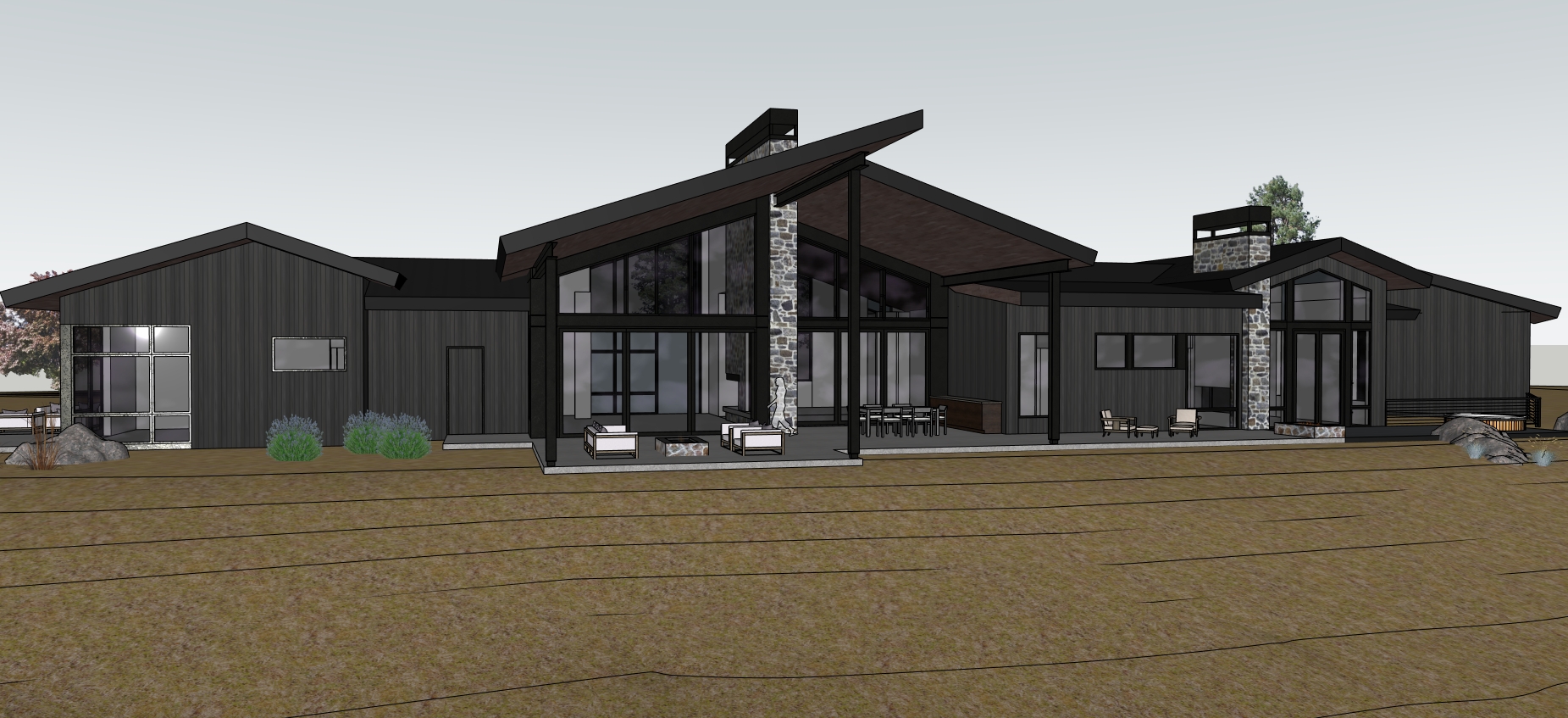 the rendering is a modern home on a sunny colorado afternoon the background is a hillside approximately 100 tall with the top 30 being a cliff the home features a stone veneer with a mixture of grey hues and an overgrout application the stones are squares and rectangles the wood siding is 8 wide in a vertical format and is a dark grey stain the roof is standing seam metal in a matte black with black trim and grey tongue and groove soffits the ground directly around the house should be small pebbles with scattered landscaping