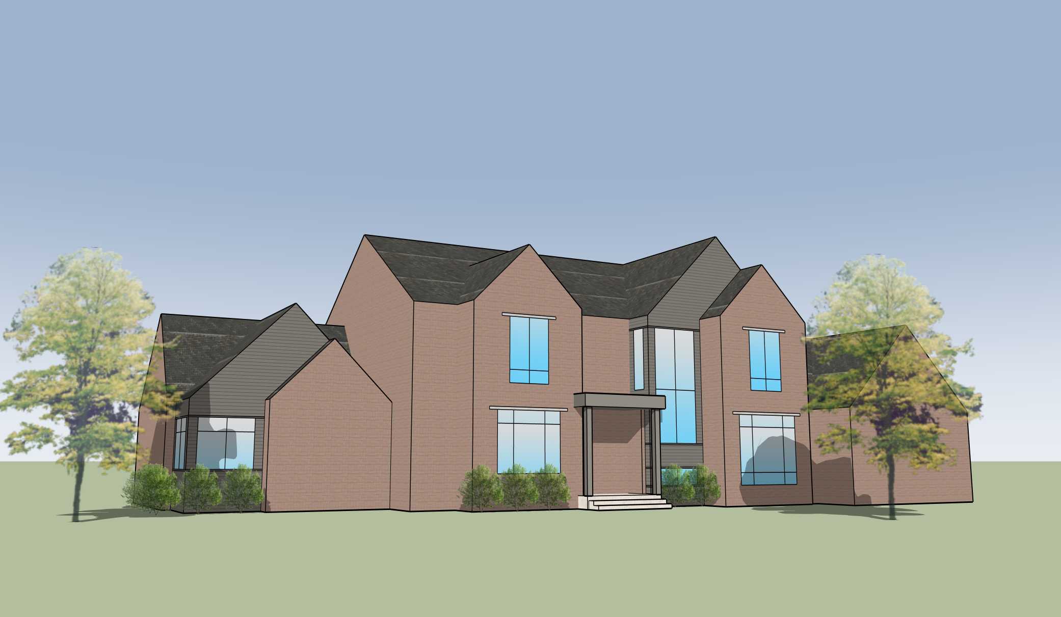 zaha hadid exterior shot dark red brick with variation dark gray roof charcoal trim black windows with grids architecture