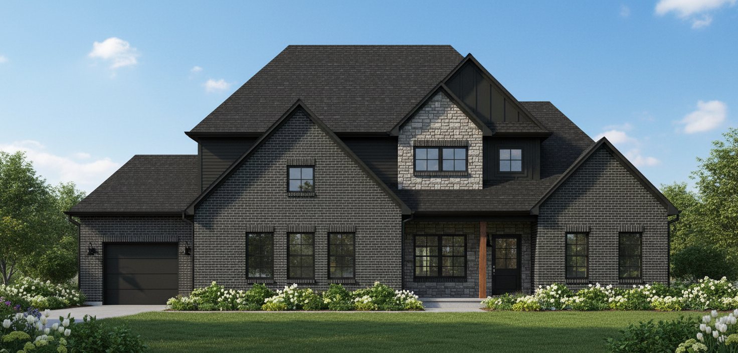 front elevation set in a midwest spring environment with green and white flowers black windows black gutters black soffit black fascia black roof james hardie rich espresso siding black brick with grey mortar provia chisel cut brindle manufactured stone stone special walnut stained cedar on the front porch post and porch header black raised panel garage door black front door