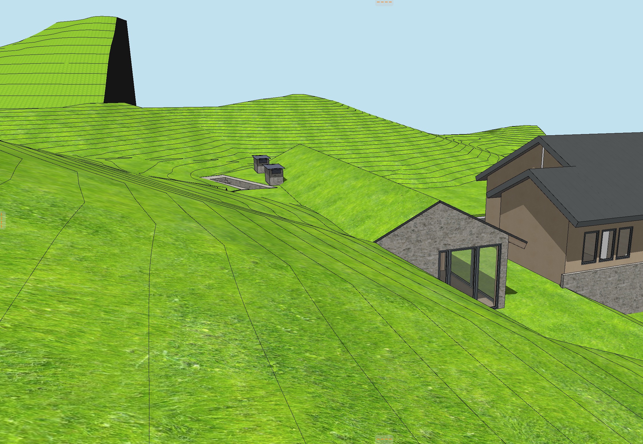 landscape hillside with sagebrush and tall wild grasses brown drystack stone walls corten standing seam metal roof