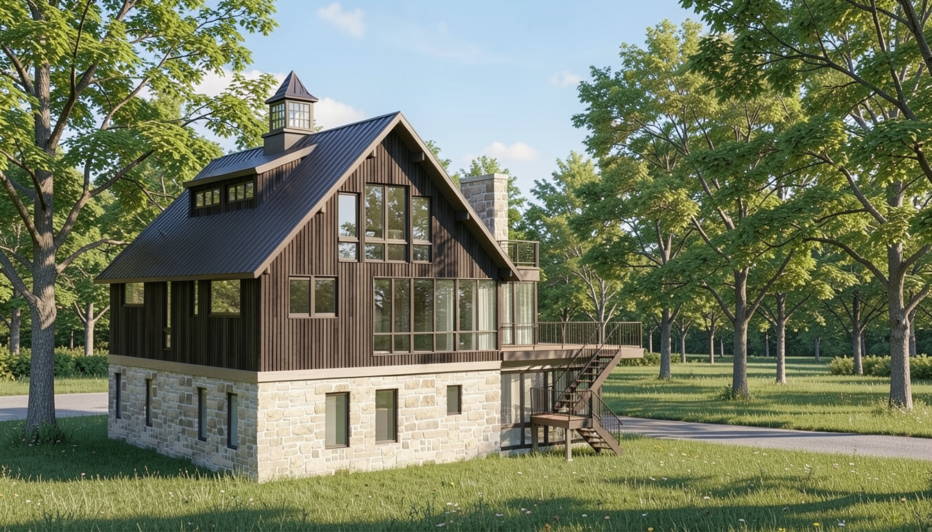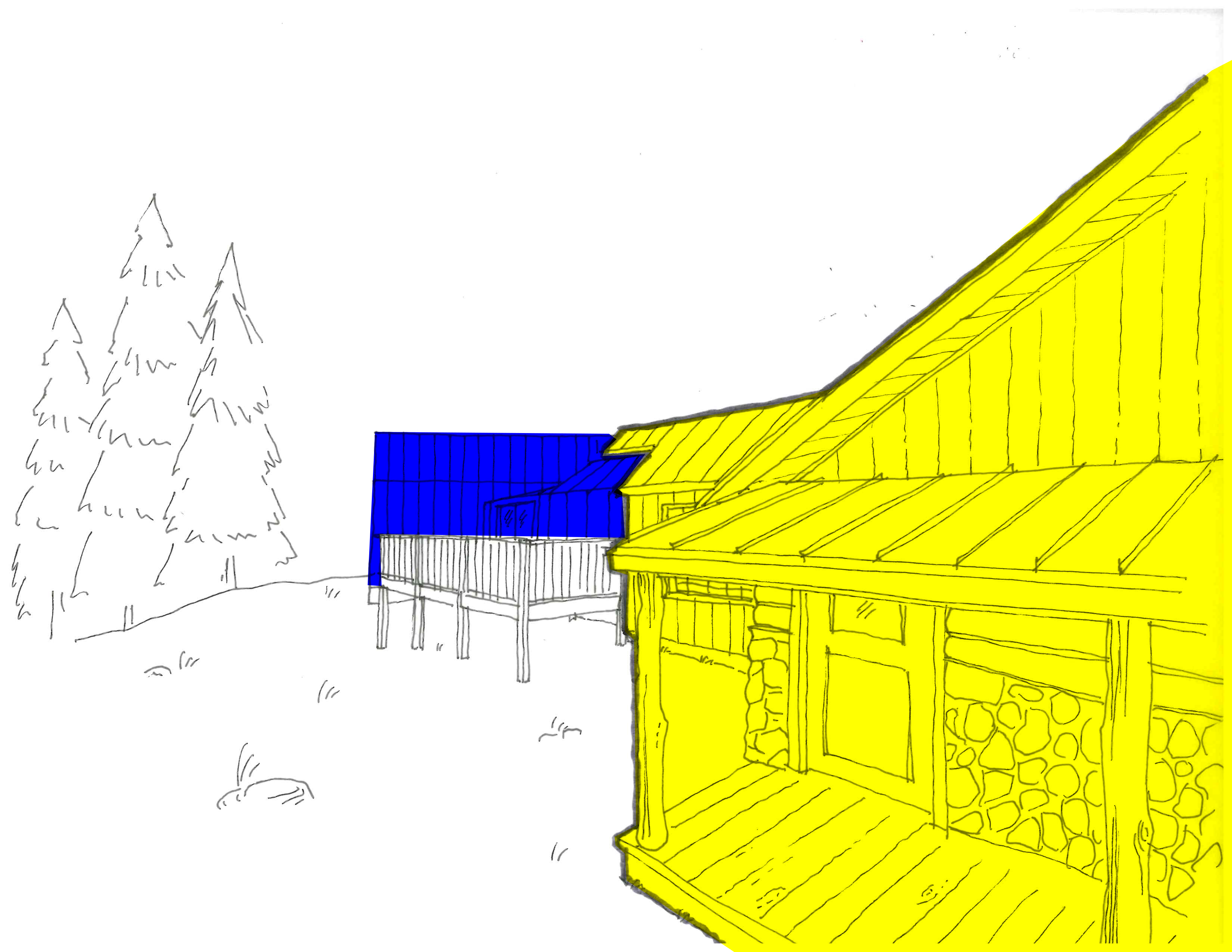 color exterior rendering make yellow part like ref 2 image make blue part like ref 1 image south dakota pine forest wood deck