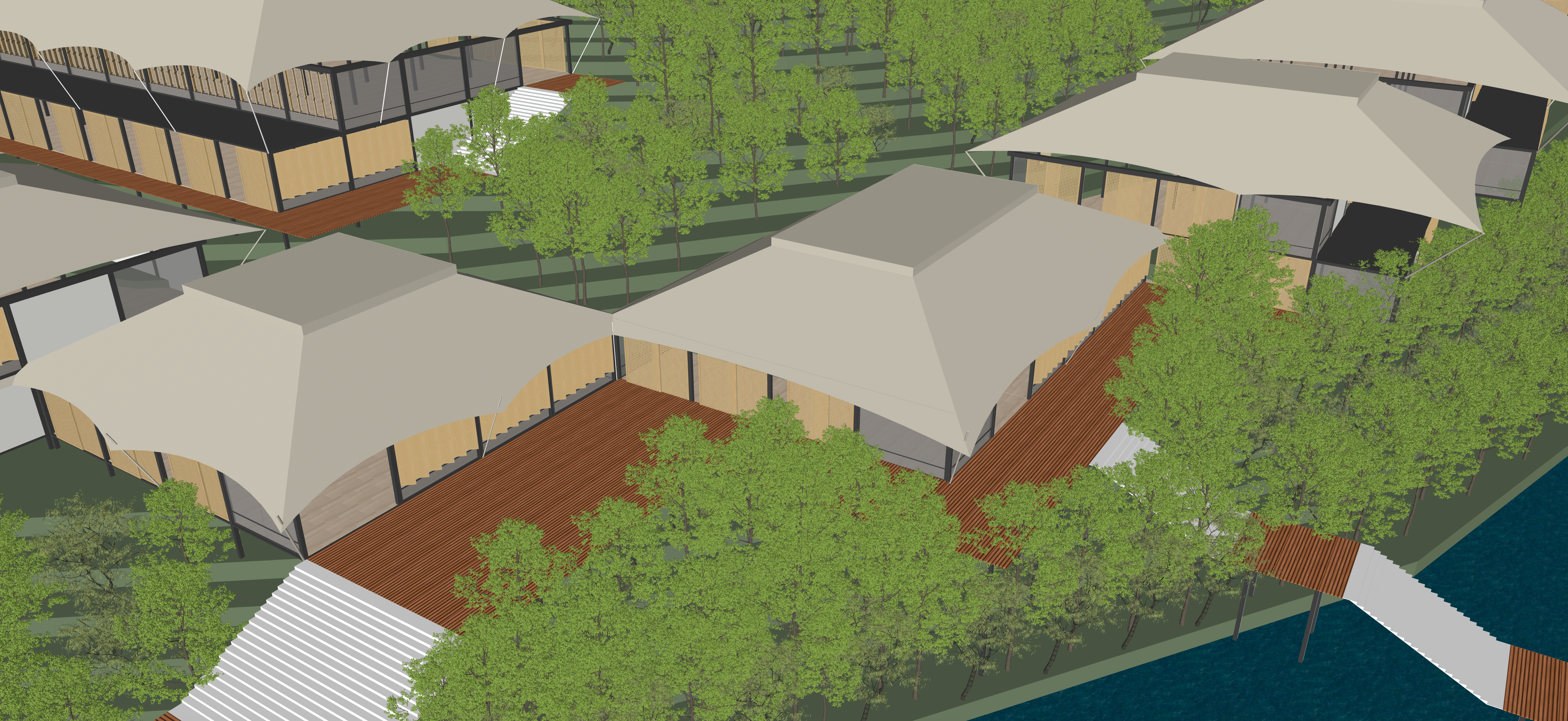 archsynth close up render enhancement of the existing 3d drawing keep the exact same camera angle geometry and building arrangement no changes enhance the restaurant s outdoor seating area refine luxury table sets elegant chairs and coastal navy color accents improve textures in the light brown tent roof wood columns and minimalist details add dense tropical forest vegetation on the hillside behind while keeping all original elements visible