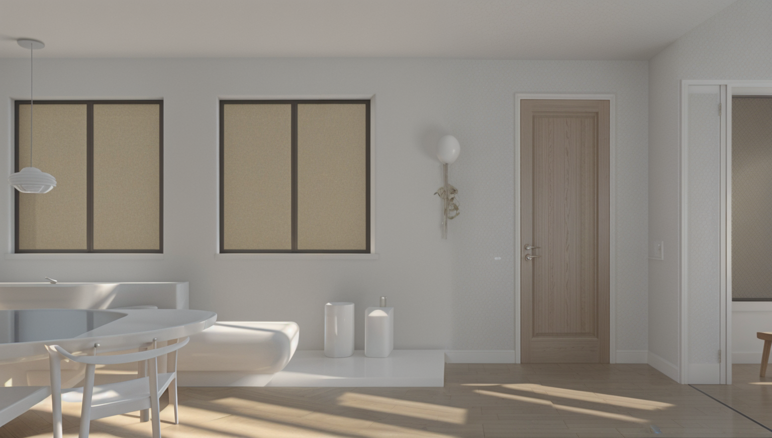 interior shot add vegetation in the windows and this 3d visualization highlights realistic window reflections and subtle shine effects to create a natural interplay between the interior and the background by adding depth and gloss to the glass surfaces the scene avoids a flat cut out look and integrates the surroundings in a more believable way architecture
