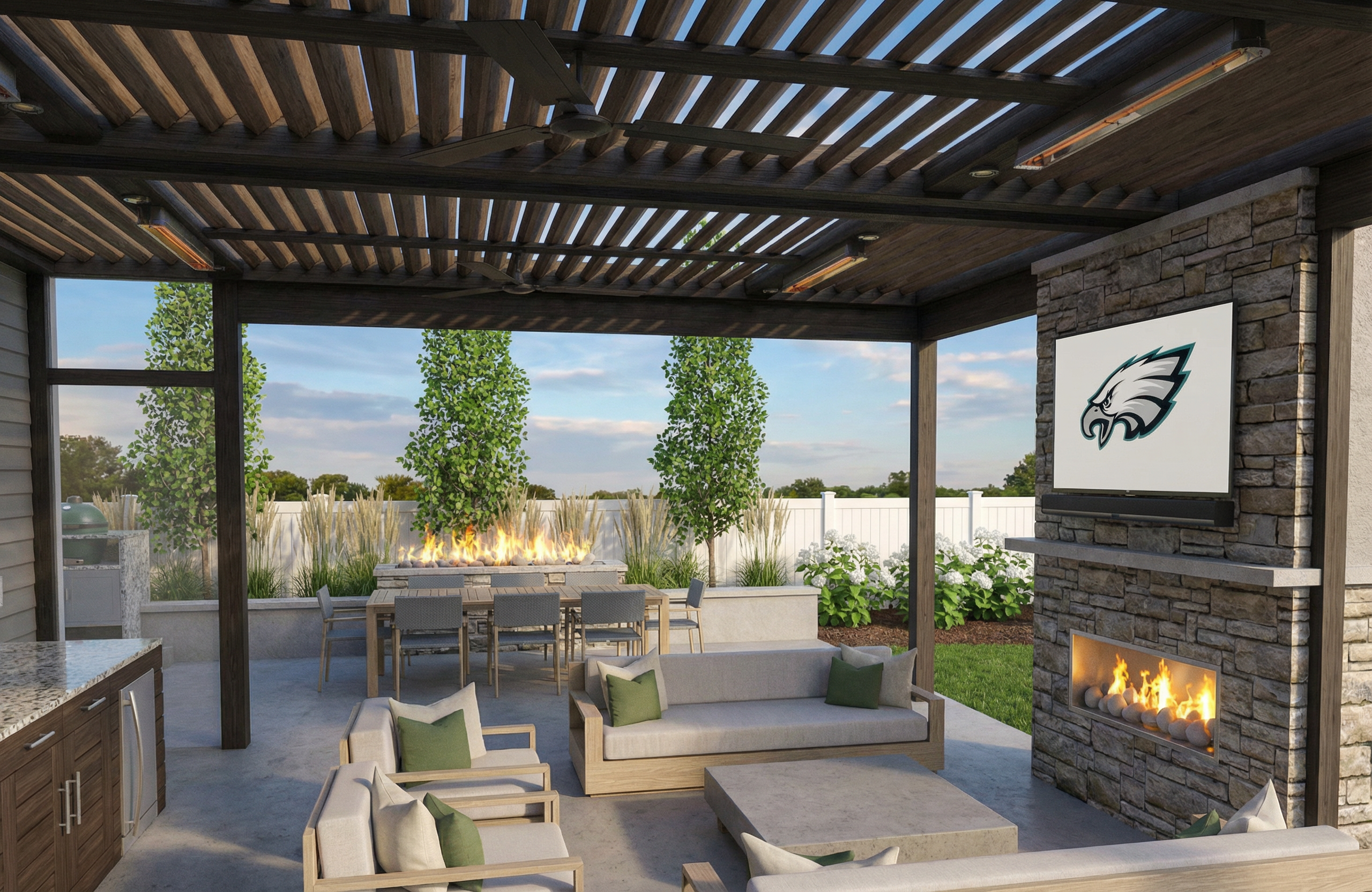 partly cloudy sky some deciduous trees in background taupe siding white windows add gutters and downspouts