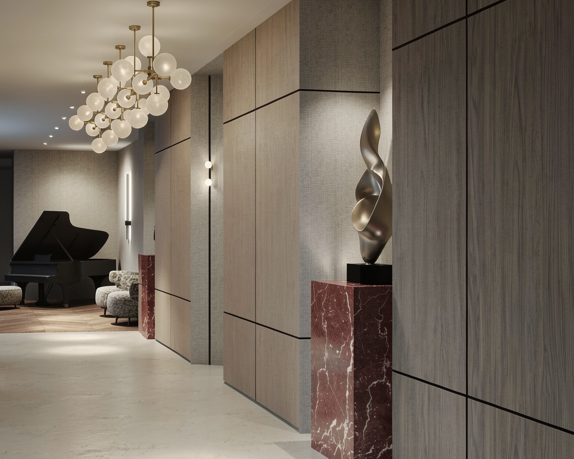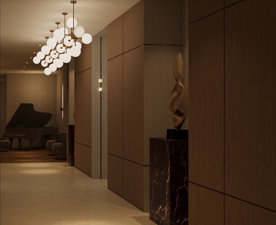 this is a basement corridore entrance there is no sunlight and no windows keep all architectural elements and design the same do not change or add anything different from the design provided enhance lighting and keep colors the same the marble blocks are rosso red marble there are two armchairs keep the chairs as they are no change to the shape or material only emphasize it s texture wall paper are light grayish biege no cartoonish look keep overall atmosphere moody and sophisticated the chandelier metal parts are light brass not yellow gold keep wood color the same meduim brown wood make the marble blocks a little burgundy rosso