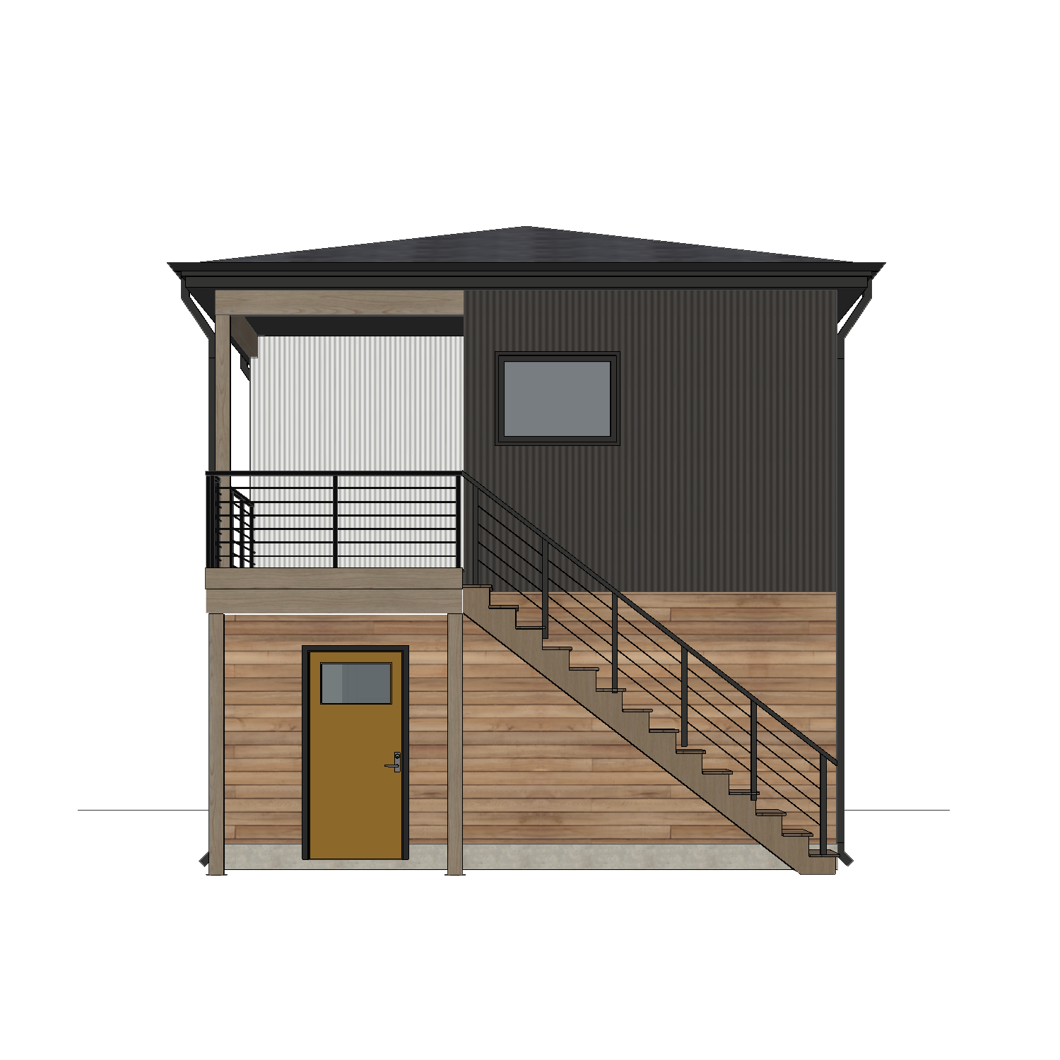 render a photorealistic 3d perspective of this house in a fenced backyard do not add any new doors or windows to the image keep model geometry the same windows doors roof walls make a grassy vegetation and young leafy trees do not change the view make the landscape nicer vegetation a vibrant clear sky with light atmospheric depth render in hyper realistic architectural visualization quality 8k resolution