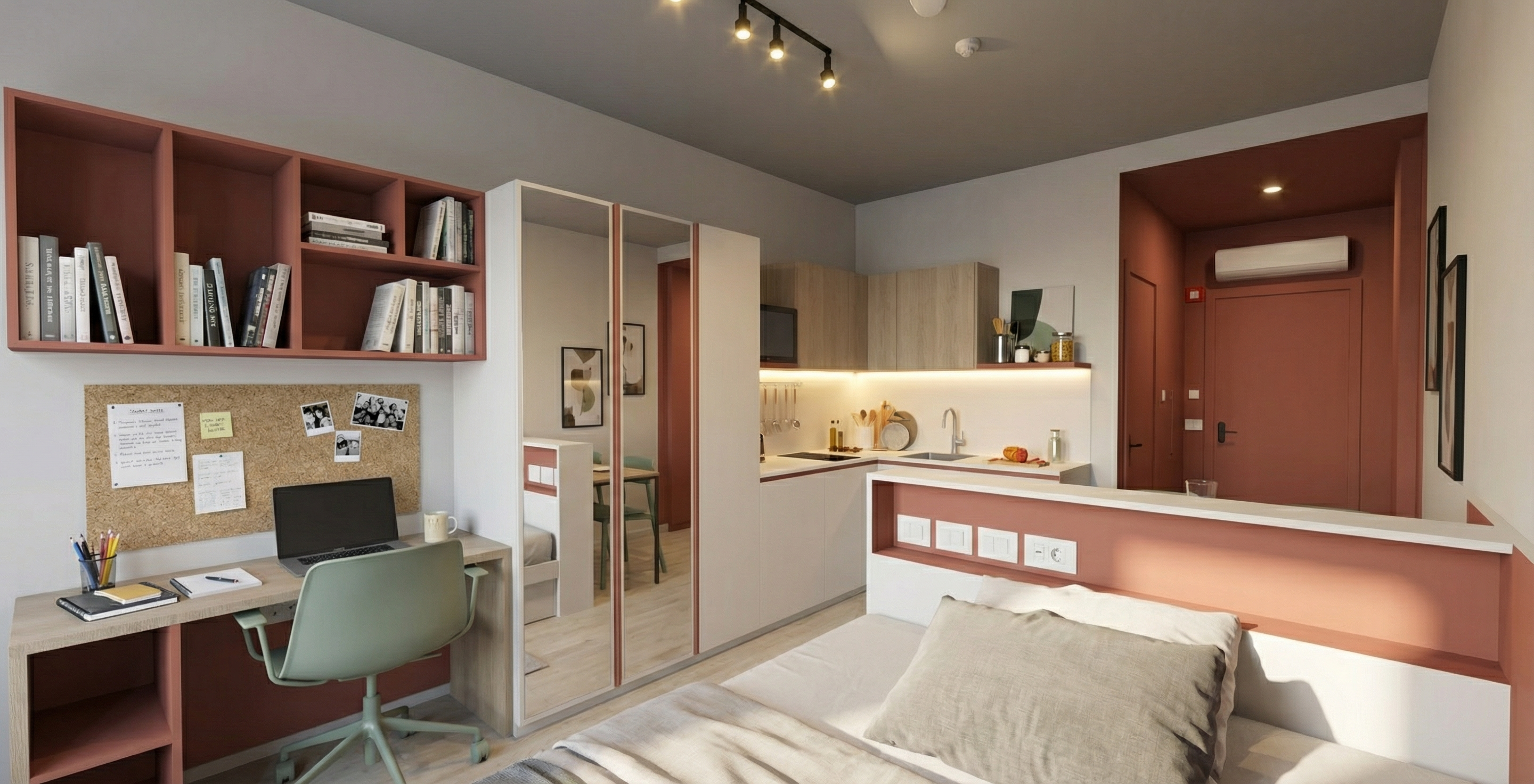 strip led sotto pensile cucina accendi faretti binario a soffitto aggiungi oggetti studente universitario basi cucina bianche il soffitto grigio molto chiaro solo la prima anta dell armadio specchiata aggiungi libri nella libreria solo scocca sedia plastica verde salvia rivestimento cucina laminato bianco opaco no lampada da scrivania no oggetti appesi in cucina