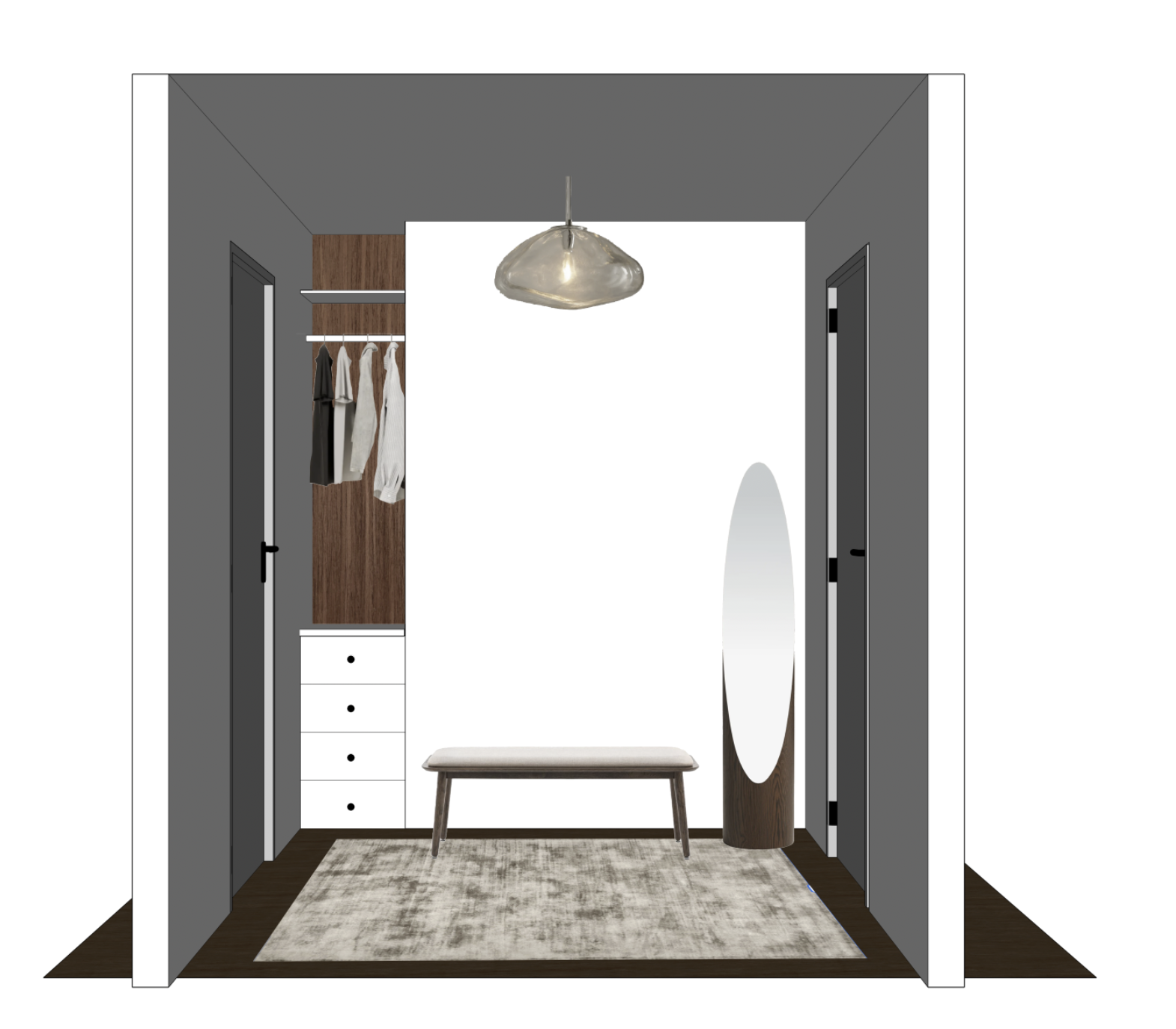 render my image add light source from the ceiling light walls should be dark grey woodwork and doors should be white keep the rug the same