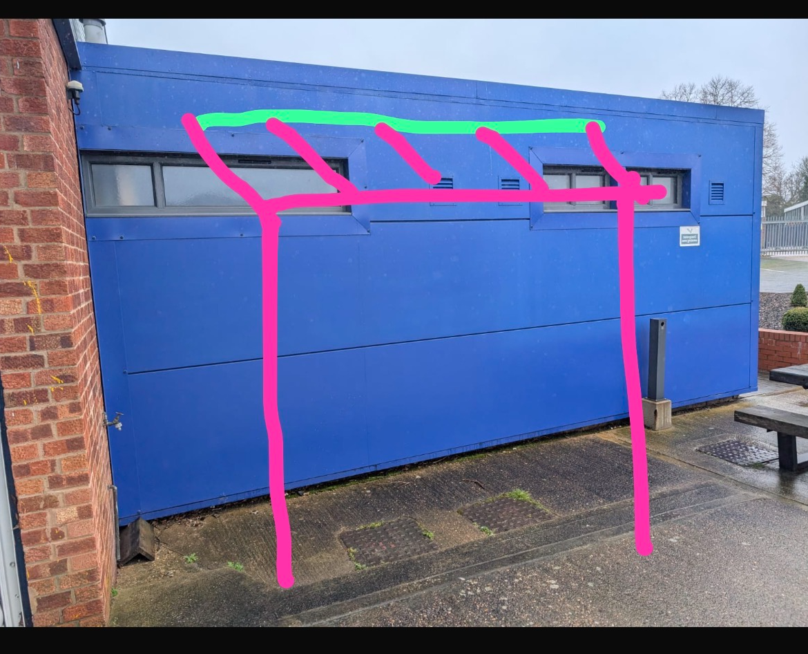use the uploaded image as the fixed base image important do not modify replace recolour or reinterpret any existing buildings walls ground surfaces fencing sky or background elements the blue building must remain exactly as shown the brick wall on the right must remain exactly as shown keep original textures colours proportions and perspective only add the veranda structure into the scene install a deponti pigato aluminium veranda system against the existing brick wall on the right hand side specifications model deponti pigato colour ral 9005 matte black aluminium installation type wall mounted lean to veranda position attached to the existing brick wall do not replace wall material posts two black aluminium support posts positioned aligned with the pink vertical guide lines roof pitch slight downward slope away from the brick wall as indicated in the sketch front beam slim modern aluminium beam with integrated gutter roof infill clear transparent glass panels between aluminium rafters glass type clear safety glass minimal tint structure must appear structurally realistic and correctly scaled remove only the central blue wall section where the veranda would open the space do not change the rest of the building keep existing concrete ground existing background fencing existing sky and lighting conditions original camera angle and perspective lighting natural overcast uk daylight style photorealistic architectural integration render