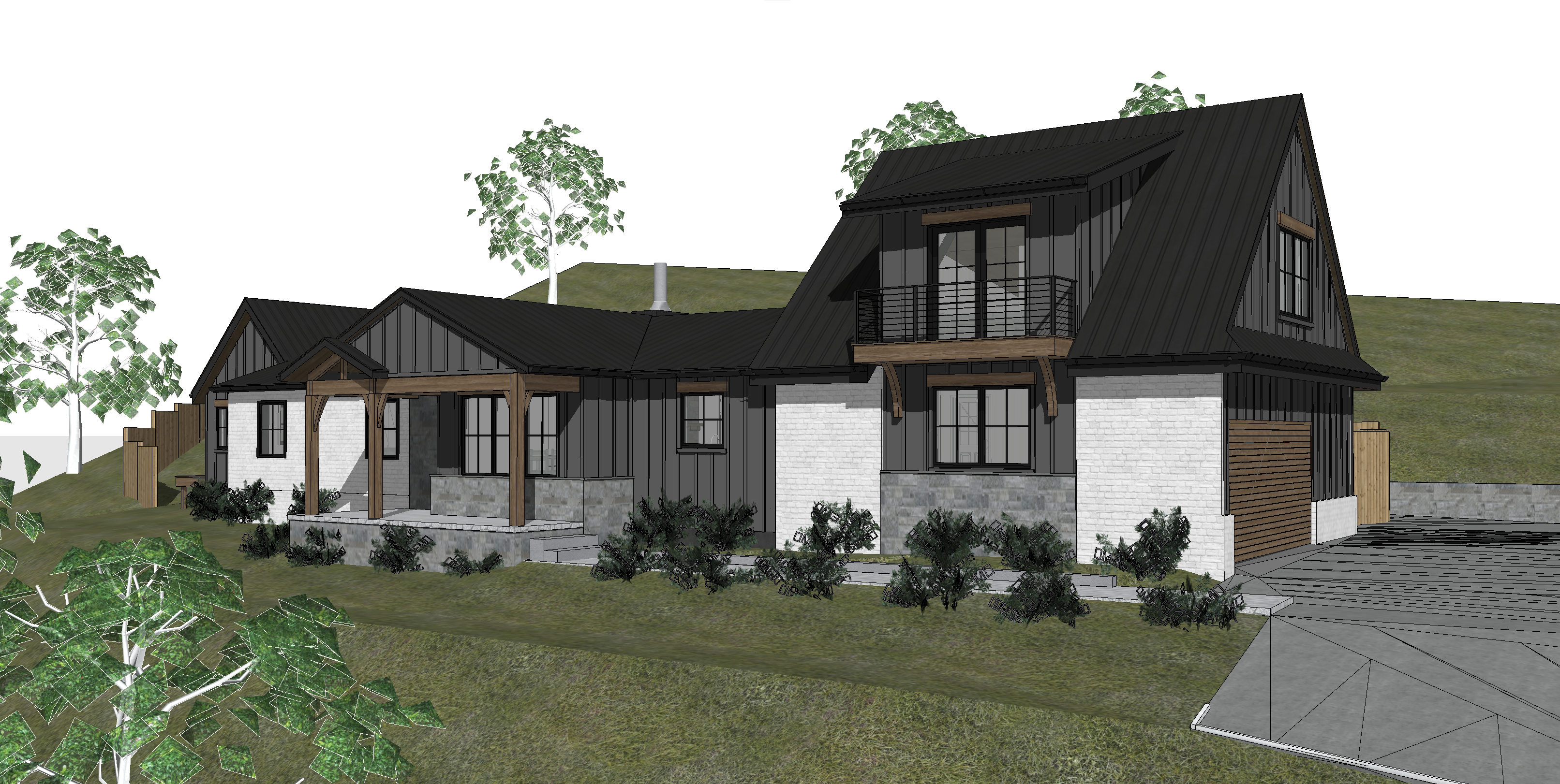 country french house with white brick and dark gray board and batten siding gray stone accents under window and porch wood accents on porch columns and beans and balcony blue sky with clouds wooden garage door on the side with driveway