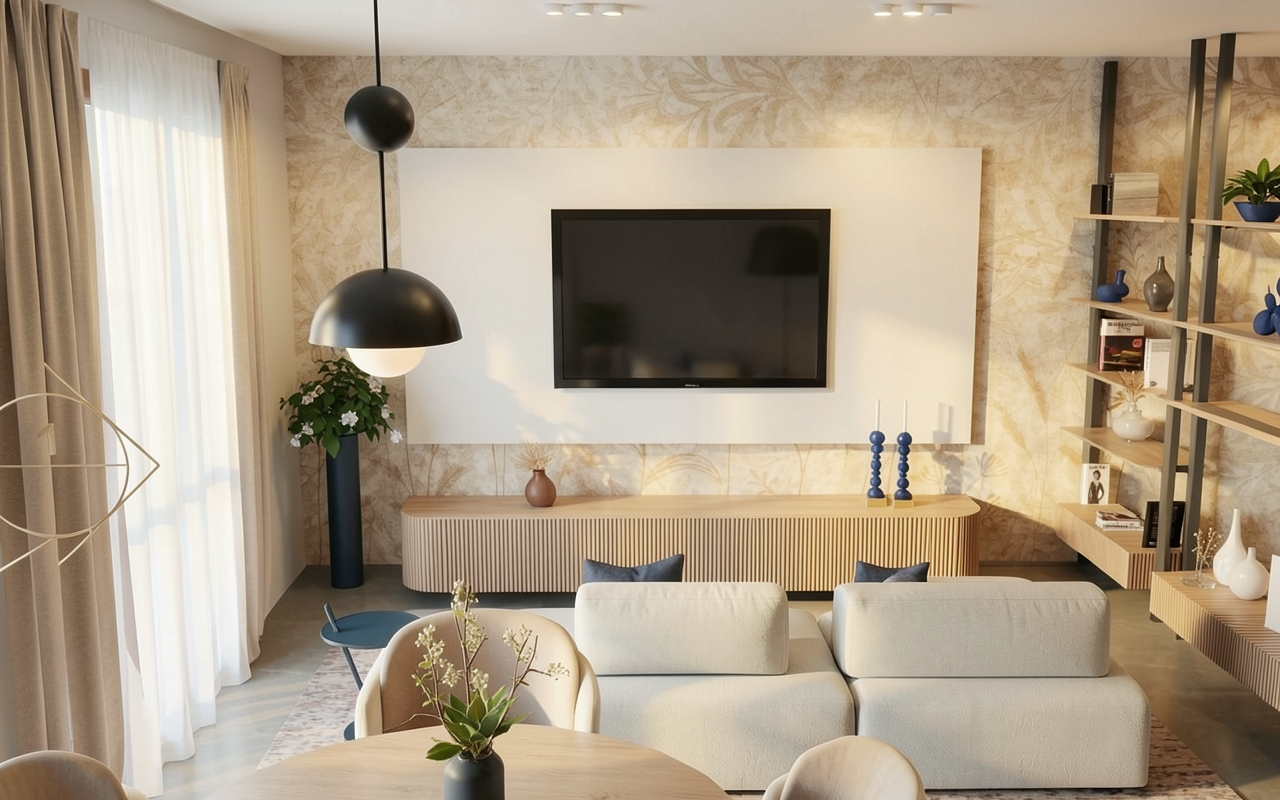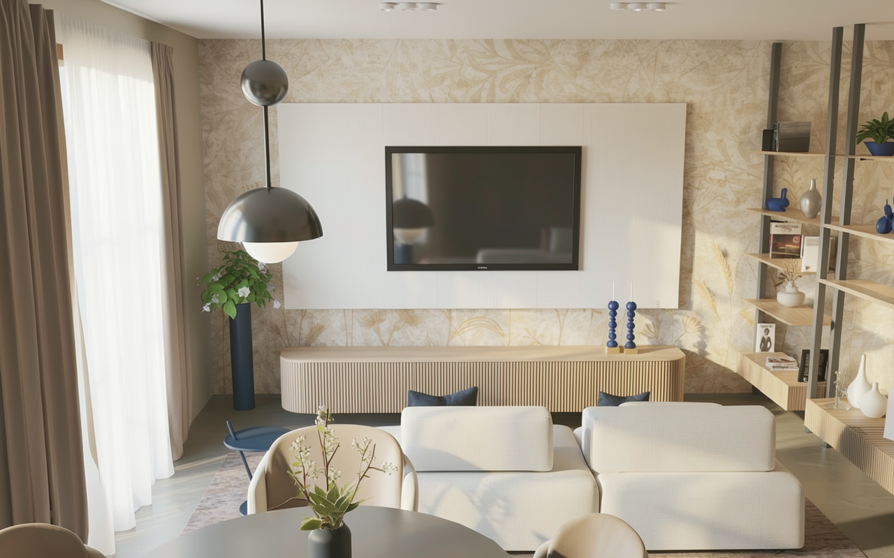 high end architectural render of a minimalist basement interior warm and cozy atmosphere on the left wall closed faux blinds with no natural light passing through primary illumination comes from a subtle integrated led strip placed behind the blinds creating a soft warm glow there s no strip led on ceiling primary illumination comes from an abat jour from the linear pendant on the table from a strip led under the shelf add some glasses ont he shelf on the right low kitchen cabinet are sand gray color mood intimate moody clean lines soft shadows photorealistic 8k resolution